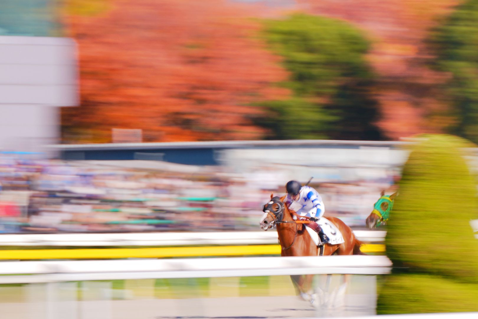東京競馬場の木々が一部色づいてました。 初夏の新緑のダービーもいいですが、この季節の紅葉の競馬の流し撮りが好き。
