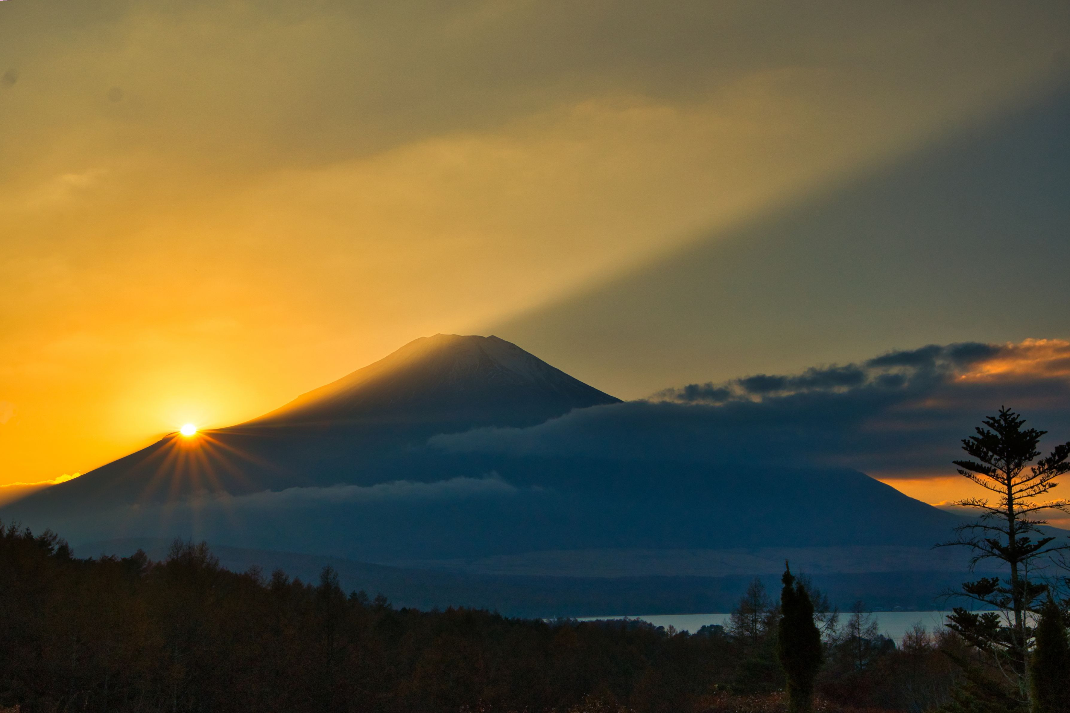 山中湖畔のホテルの庭で撮りました。 富士山に沈むお日様の光が綺麗な夕暮れを演出してくれていました(^^♪