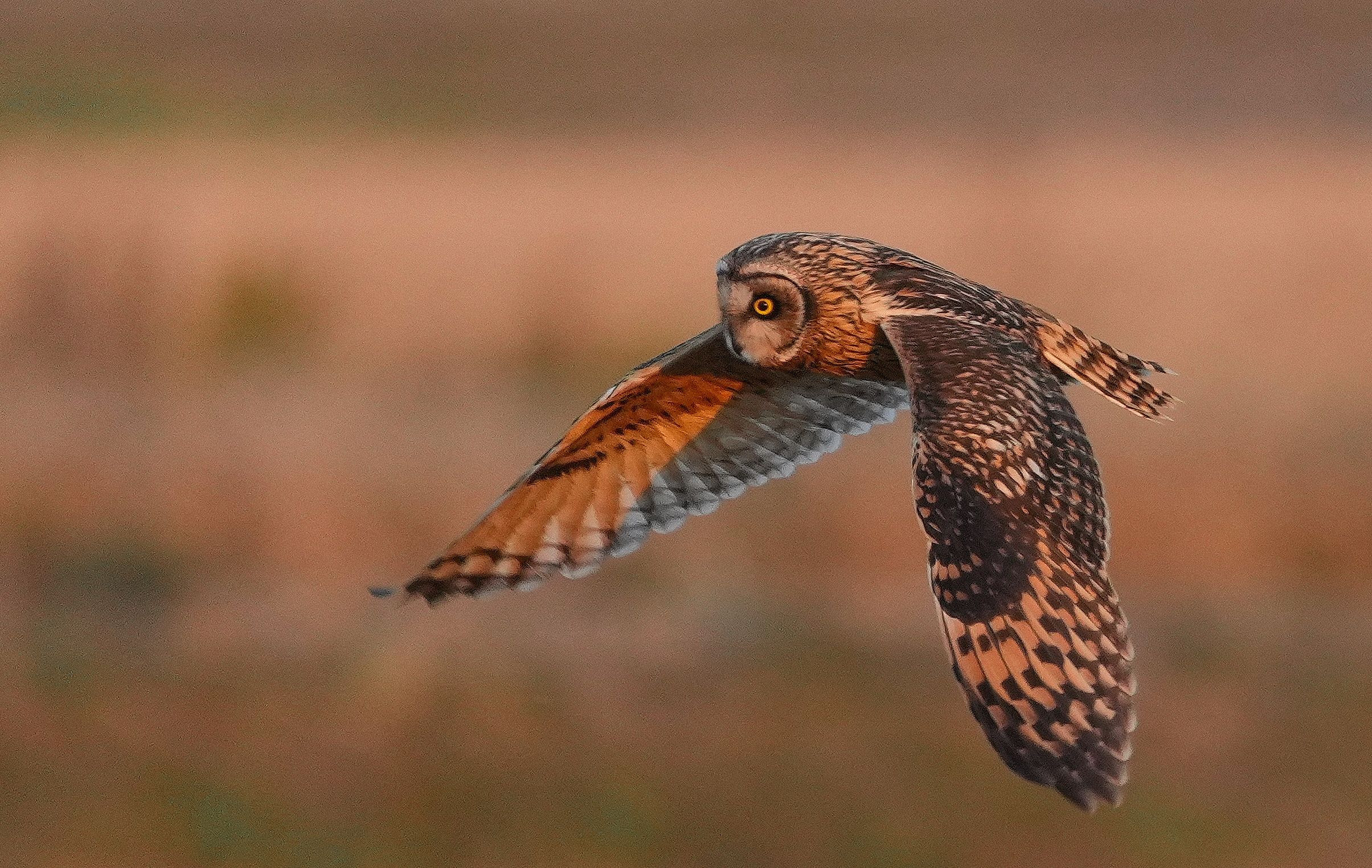 晴天の夕日を浴びて飛び回るコミミズク!