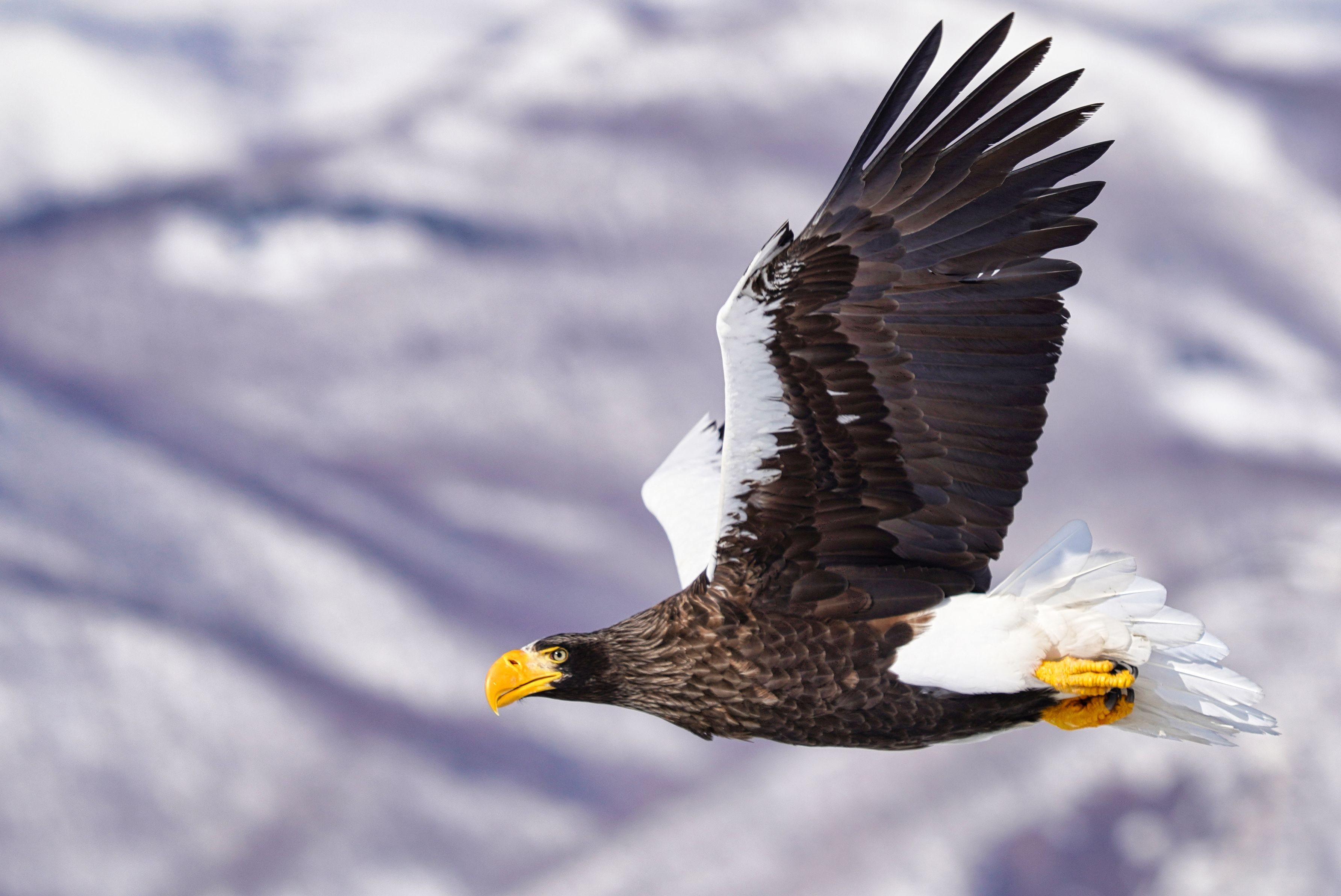 製品情報>My Sony>αcafe>羅臼岳を背負って飛ぶオオワシ!(デカ橋さん)