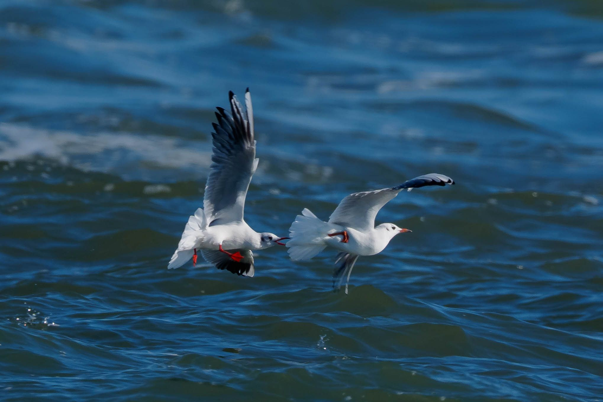 岩場が散在する波荒い海岸で、1羽のユリカモメが他の1羽のユリカモメを攻撃して追いかけていました。