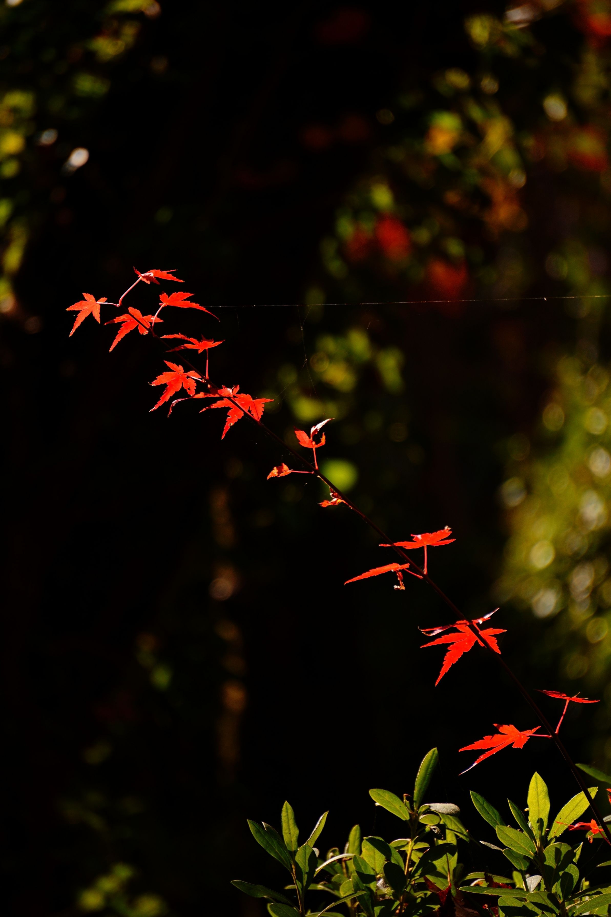 紅葉を撮りに行ったら暗い所に赤い飛翔体のように輝いているのが見えました。 なにって見たらまだ幼いモミジの木が葉を目一杯赤くして私に美しさをアピールしていました(#^^#)