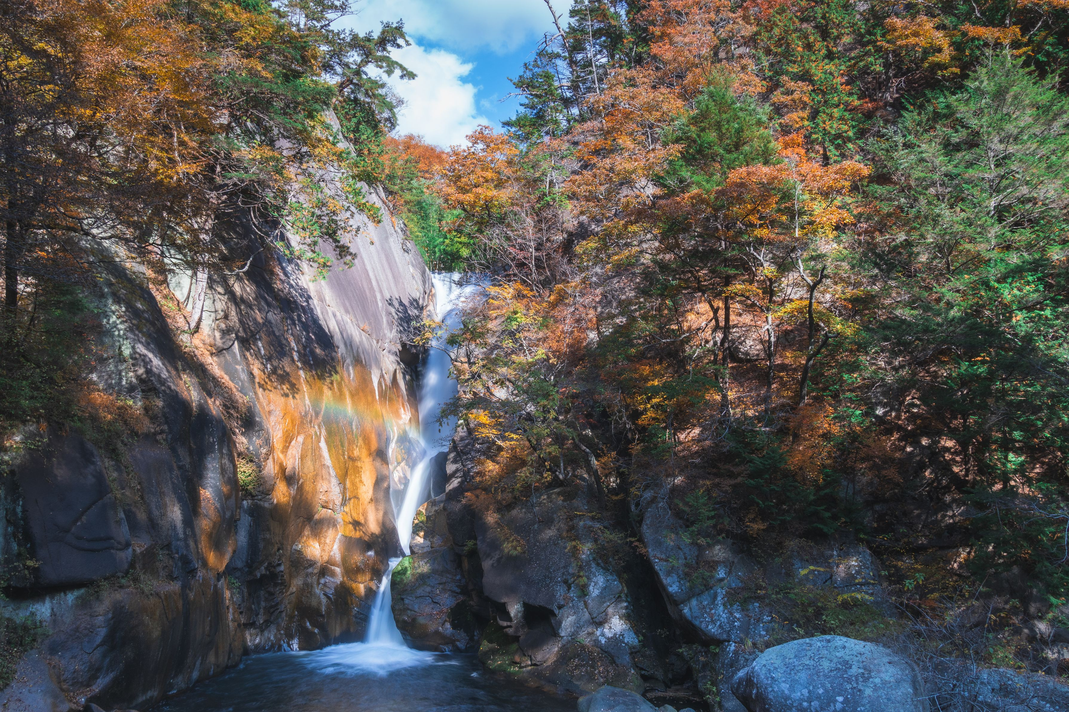 先日昇仙峡の仙娥滝に行った時の写真です。 紅葉と滝つぼに虹が出ていて綺麗でした!