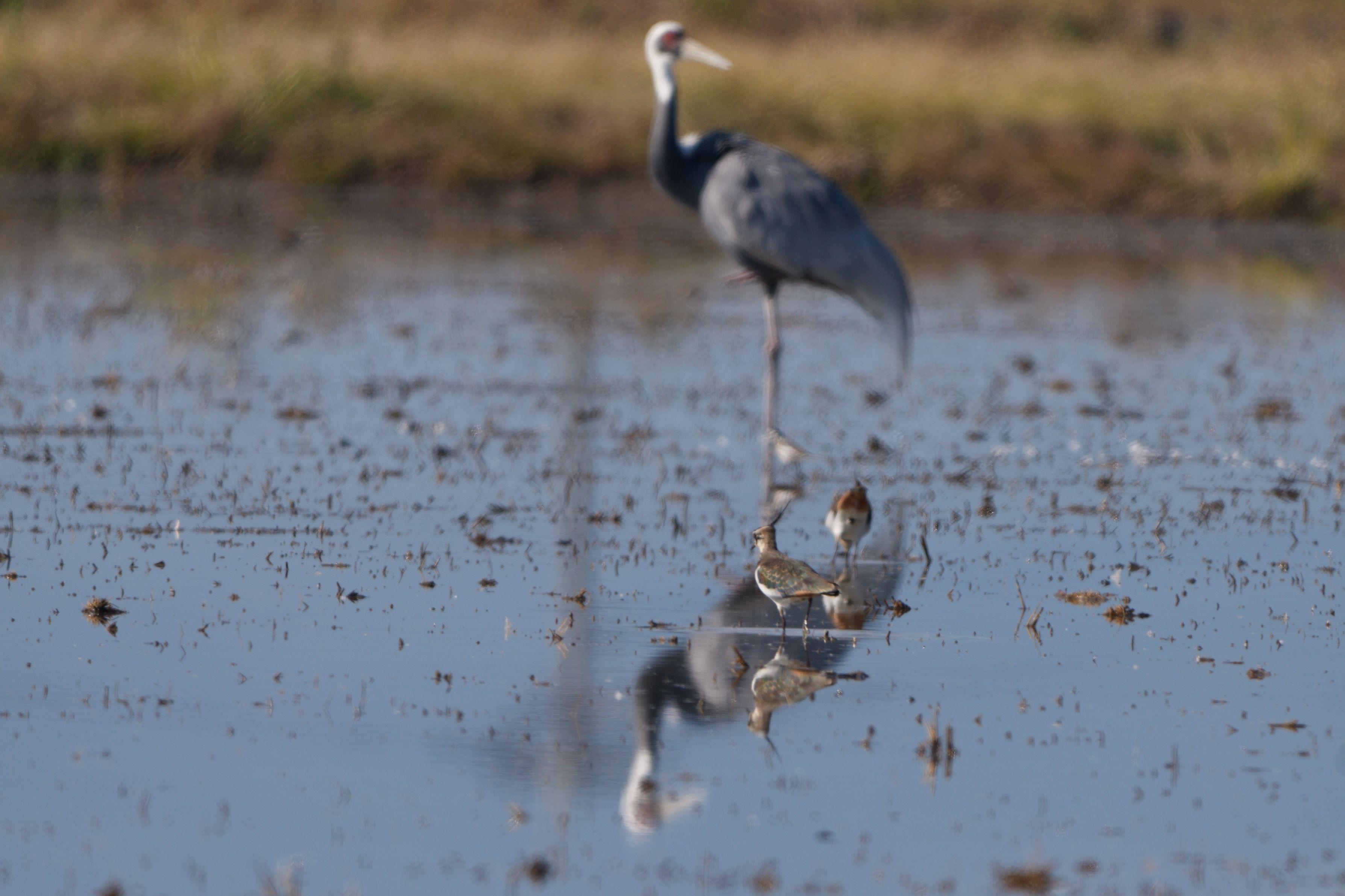 玉名市横島干拓を探鳥しているとここにもマナヅルがいると車を止めて写しているとタゲリも3羽ほど一緒にいました。