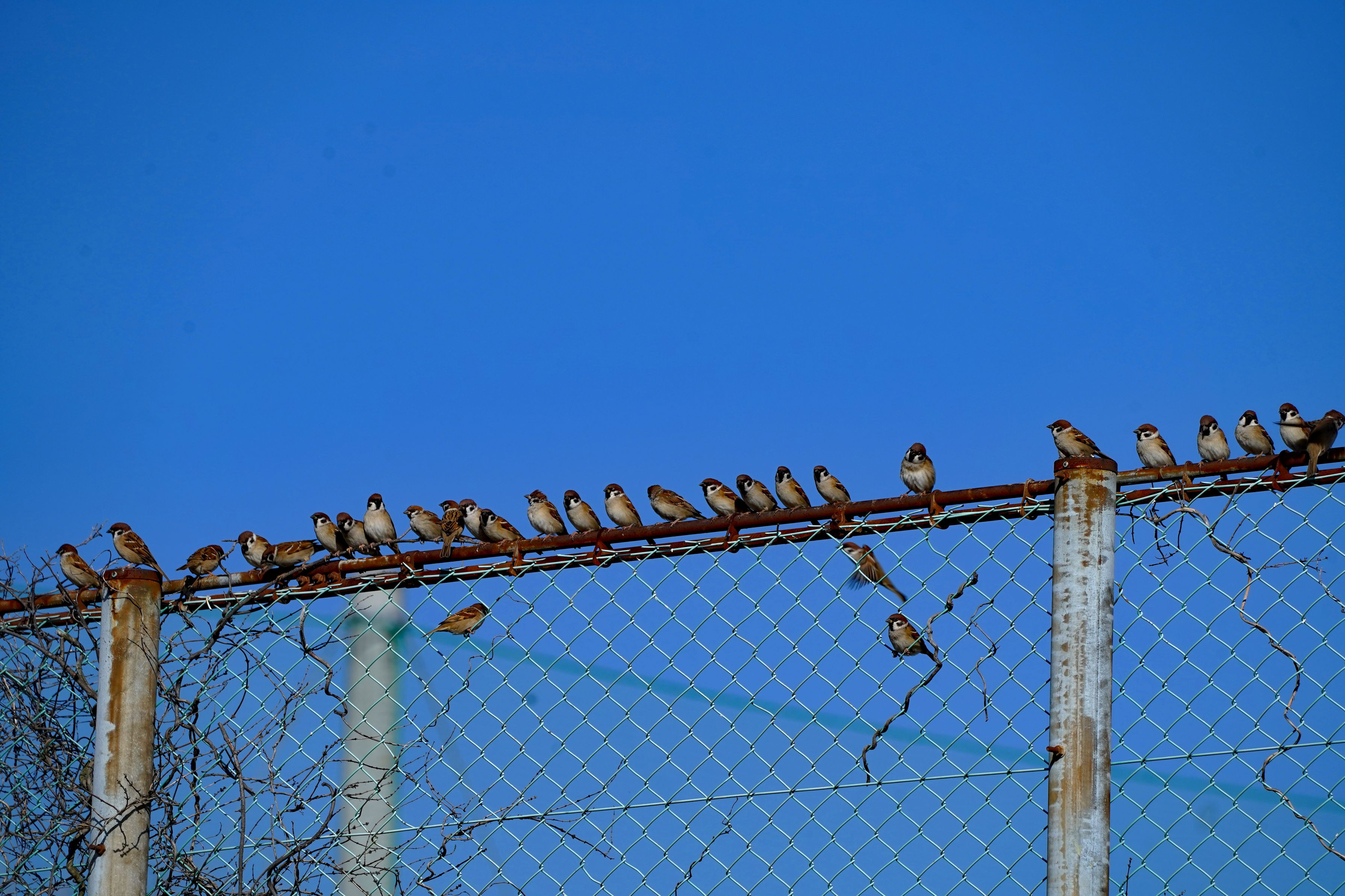 フェンスにとまりみんなで日向ぼっこ