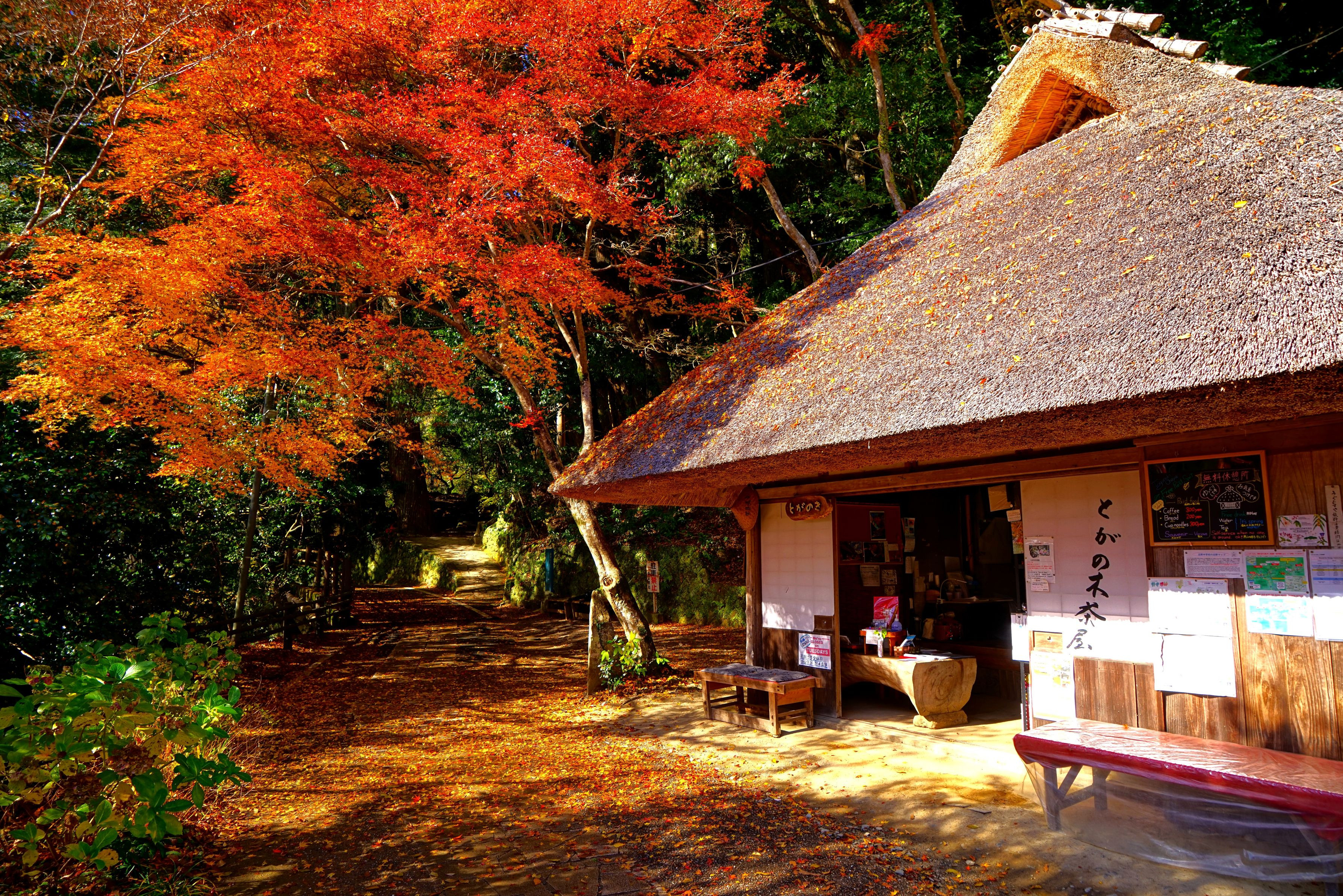 熊野古道中辺路「継桜王子」のそばにある休憩所「とがの木茶屋」の紅葉です。 紅葉シーズンには毎年訪れていますが、古道に落ち葉が残る光景は初めて見ました。 管理するスタッフ聞くと、写真を撮る方の要望が多くて…私もその一人ですが。