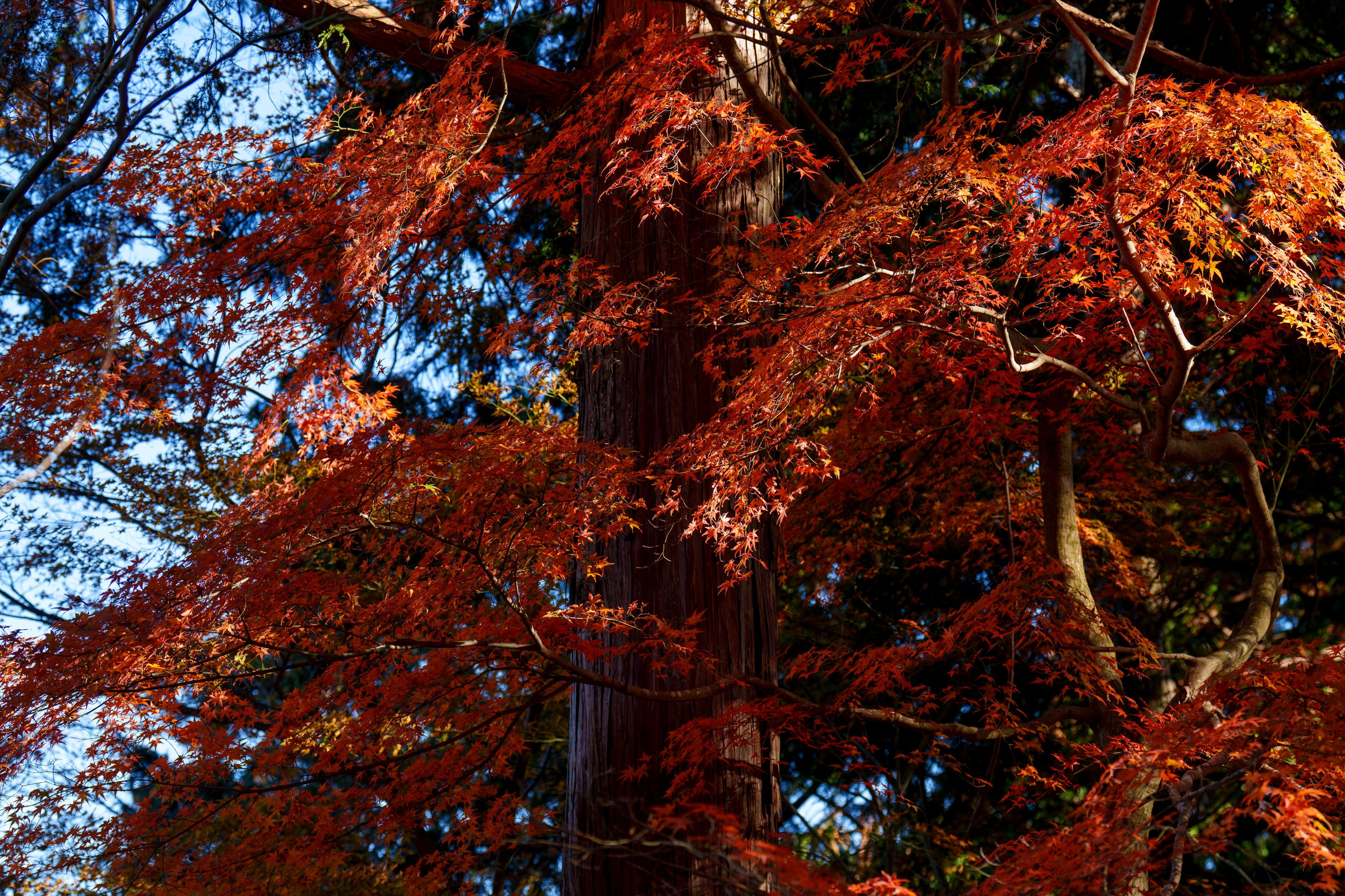 杉と紅葉が寄り添って立っていたので望遠レンズで撮影。まるで杉が色づいているように見えました。
