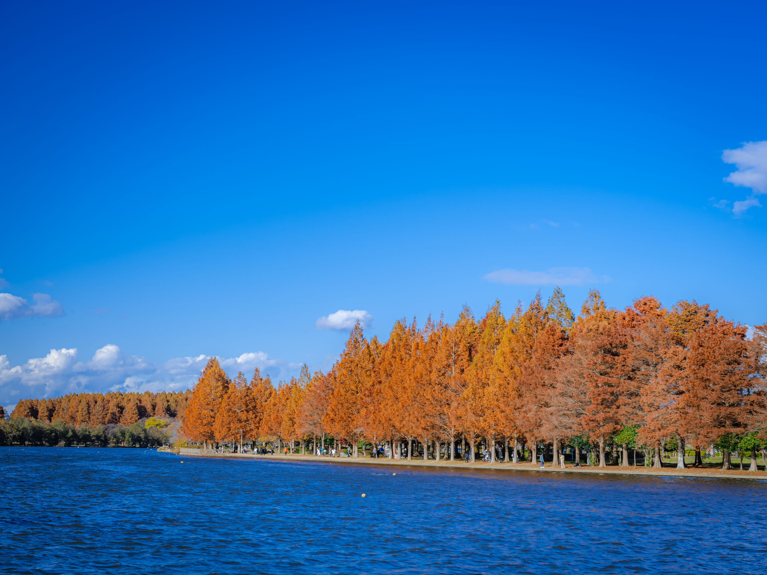 東京都の水元公園の風景です。 紅葉と青空のコントラストが非常に美しい日でした。
