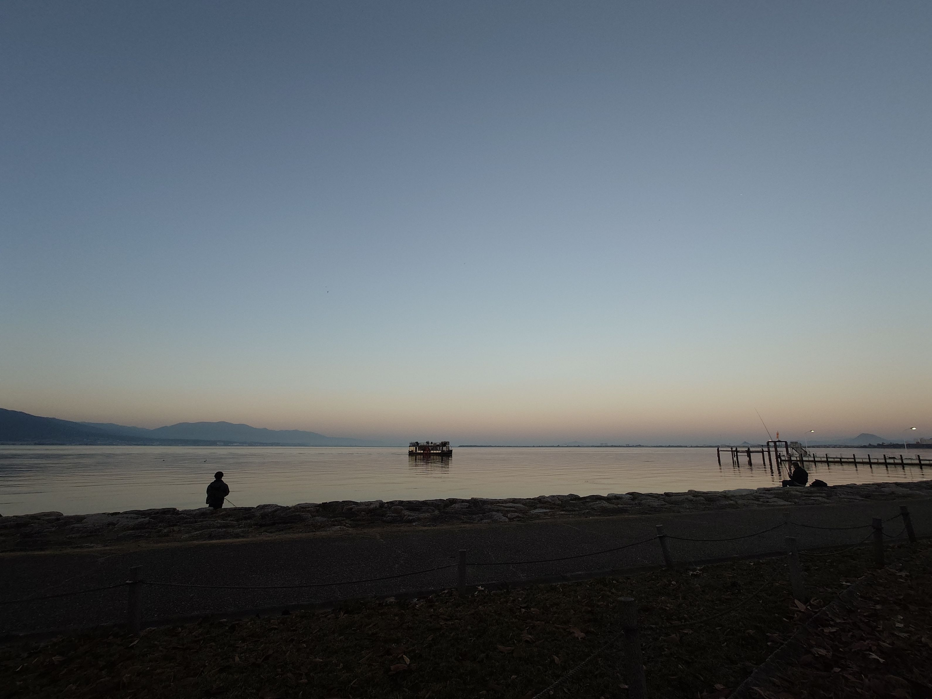 琵琶湖の湖面が金色の様に輝く、晩秋の夕暮れを、観光客を乗せた船が通り過ぎたのを撮ってみました。
