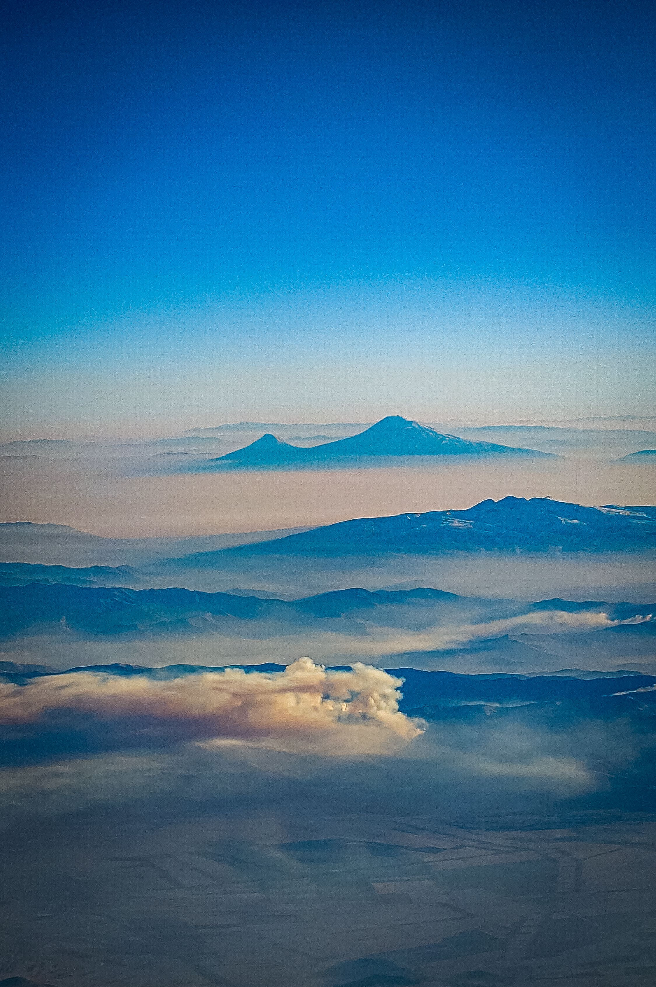ジョージア上空にて山火事を見ました。遠方にはアルメニア最高峰のアラガツ山。 富士山は12388ftですが、この山は13420ftだそうです。