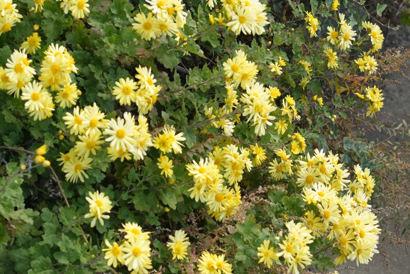 キクが散歩道に咲いていました。花は小さな花ですが色がきれいです。キクはやはり秋らしい花です。 マクロ100mm F8 でマニュアル撮影しました。