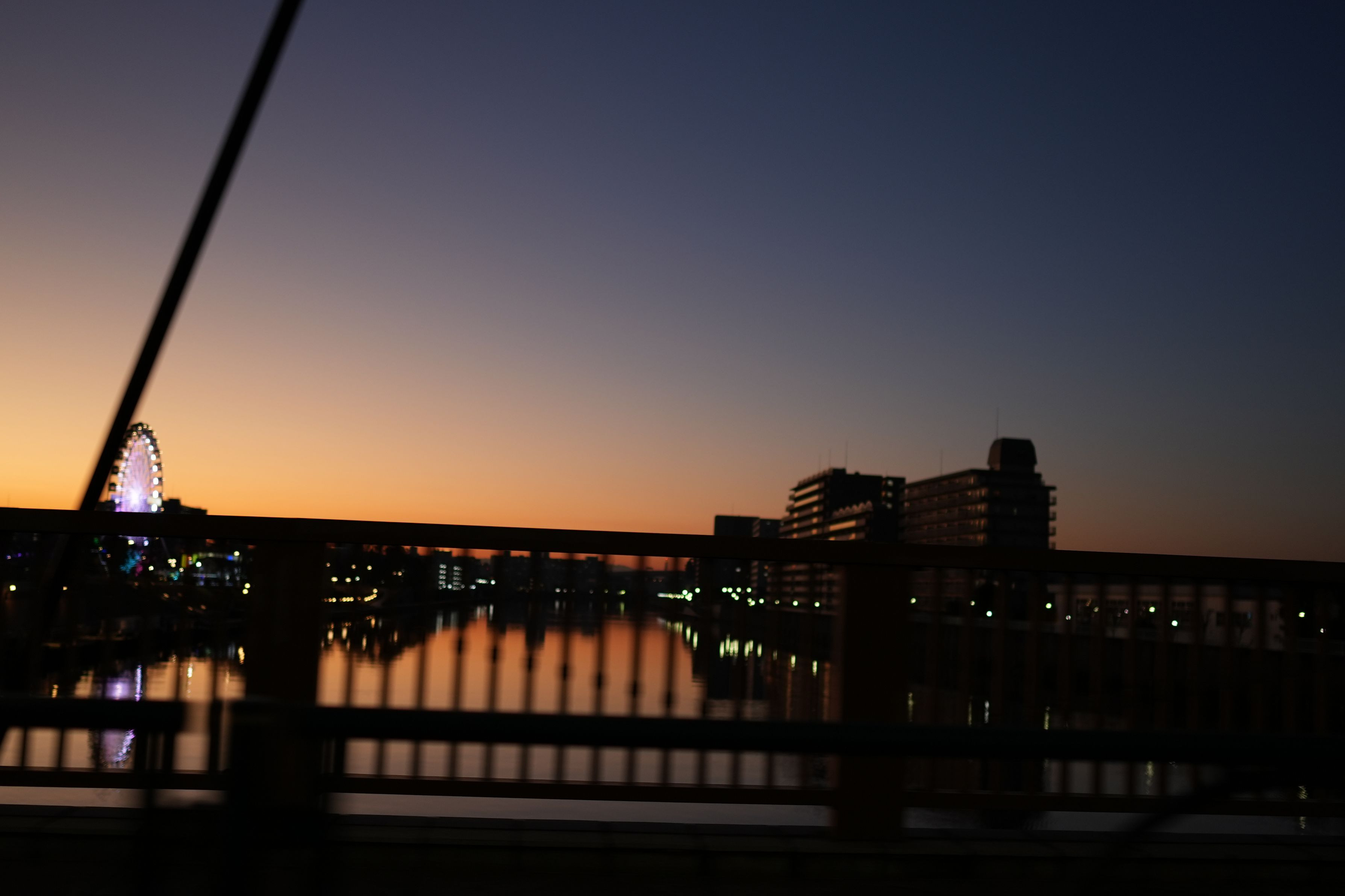 沈む夕日が川面を柔らかく染め、街の灯りが静かに浮かび上がります。観覧車の光が夕景の中でひときわ存在感を放ち、通り過ぎる一瞬の景色に温かい余韻を添えています。日常の移ろいの中に潜む、美しい時間を捉えた一枚です。