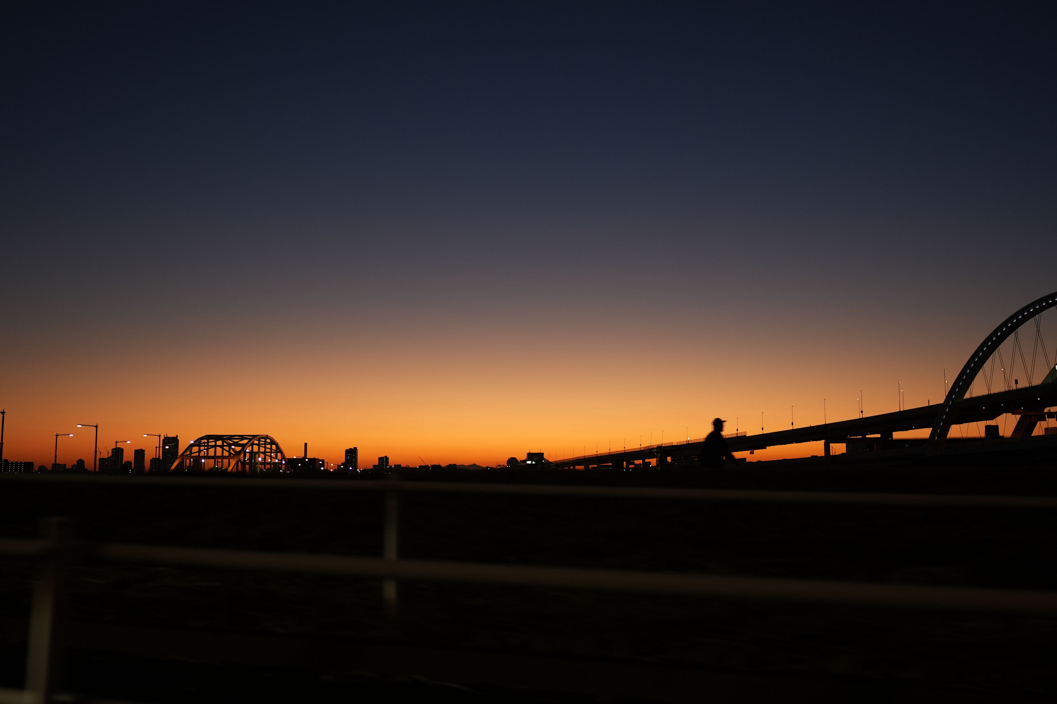 沈む夕日が広げた橙色の光が、橋のシルエットと街の明かりを静かに包み込みます。滑らかに変わる空のグラデーションが、日常の風景にひとときの美しさを与えています。都会の喧騒から離れたような穏やかな時間を切り取った一枚です。
