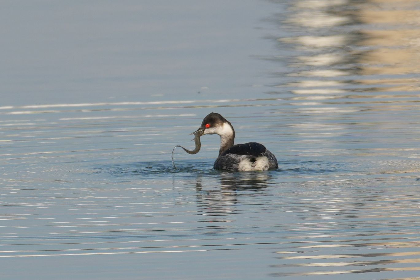 全く波がなく鏡のような海面に浮かんだ一羽。赤い目が何といっても印象的で、獲物が身をくねらす様が自然の厳しさを示していた。 500mm F5.6 DG DN OS #ハジロカイツブリ#
