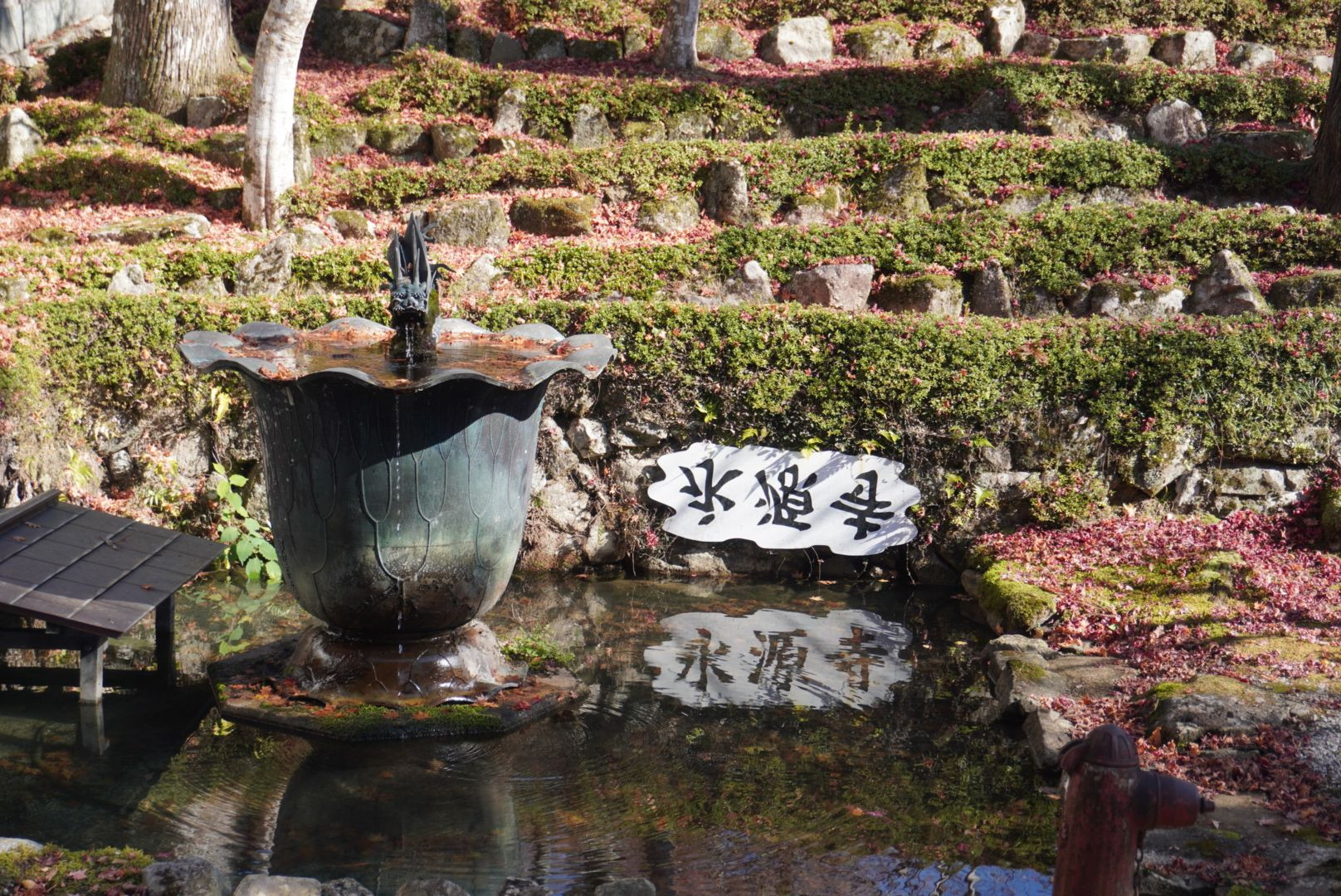 永源寺境内の池の逆さ看板