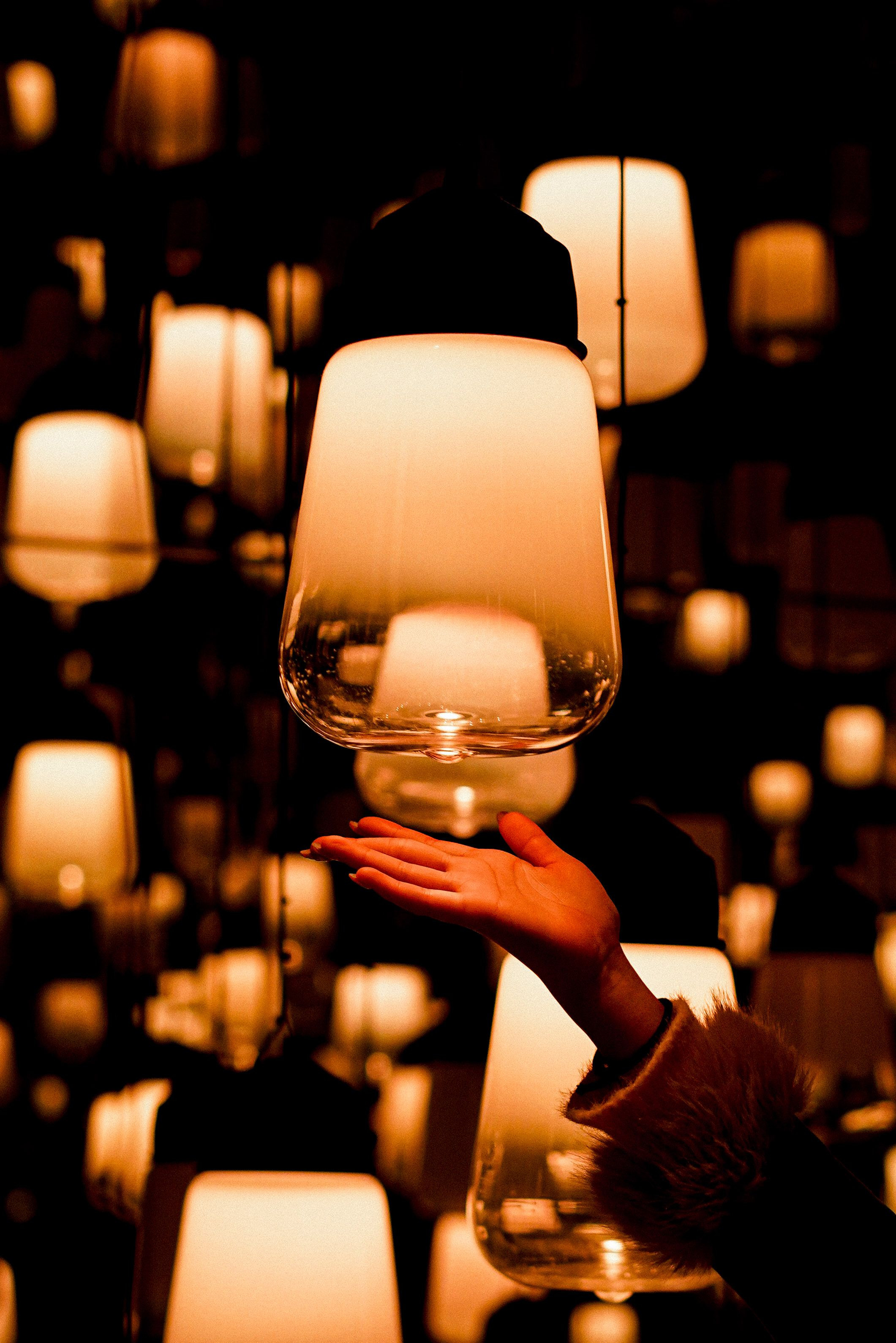 チームラボバイオヴォルテックス京都にて撮影。 幻想的な灯りが無数に浮かぶ空間で、そっと手を伸ばした瞬間を捉えた一枚。
