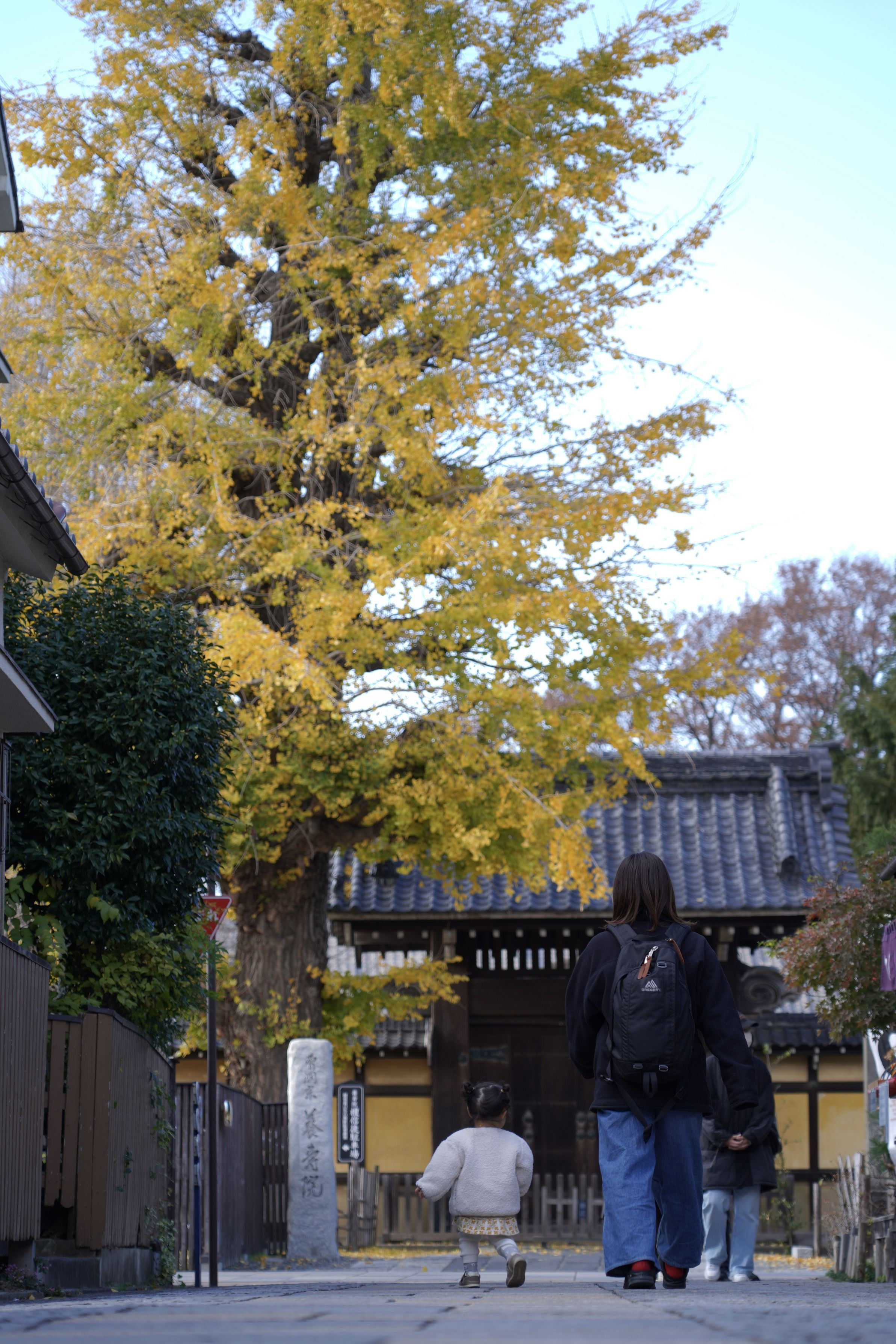 川越に行った時に、お寺の雰囲気とイチョウの葉が綺麗だったので妻と娘の後ろ姿を入れて撮りました。