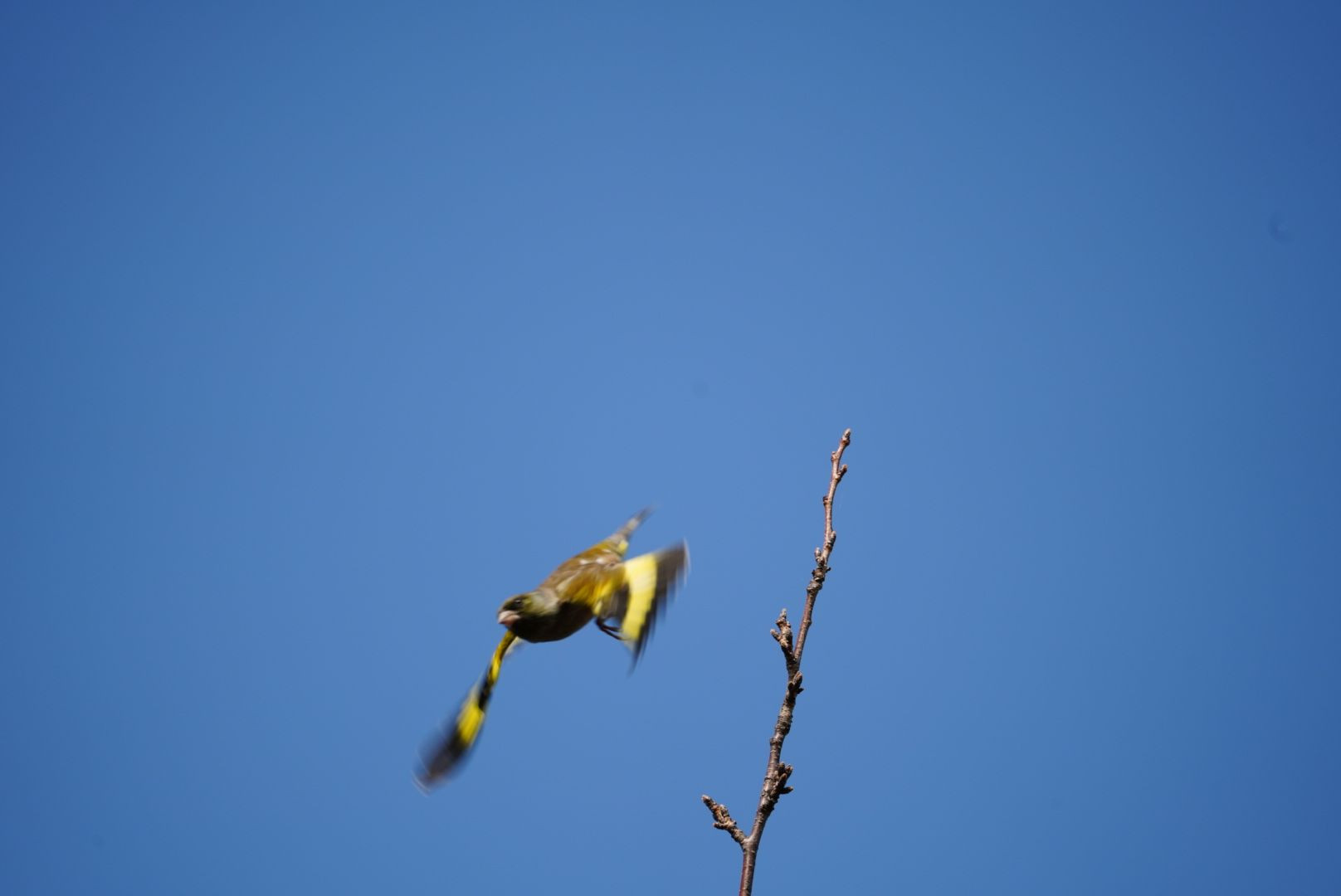 暫く木の上で鳴いていましたが、近くの畑に餌を発見した様で、急降下していくところを撮影しました