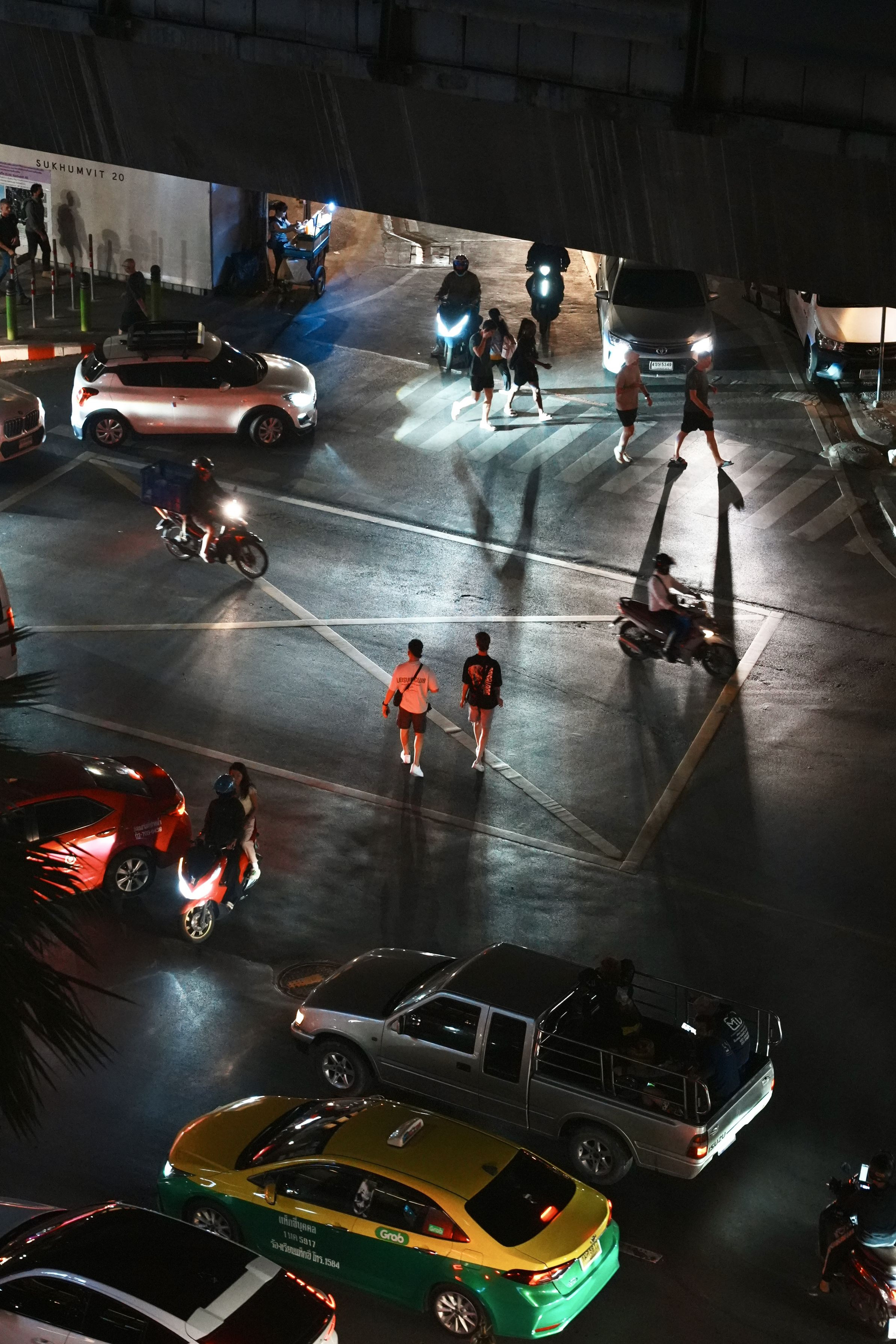 バンコクのホテルの窓から道を見下ろしていたらなかば無理やりに交差点のど真ん中を突っ切っていく観光客がいたので思わず撮影しました。 テールランプの赤色で照らされた瞬間が撮れたのでなんとなく浮かび上がってくれました。