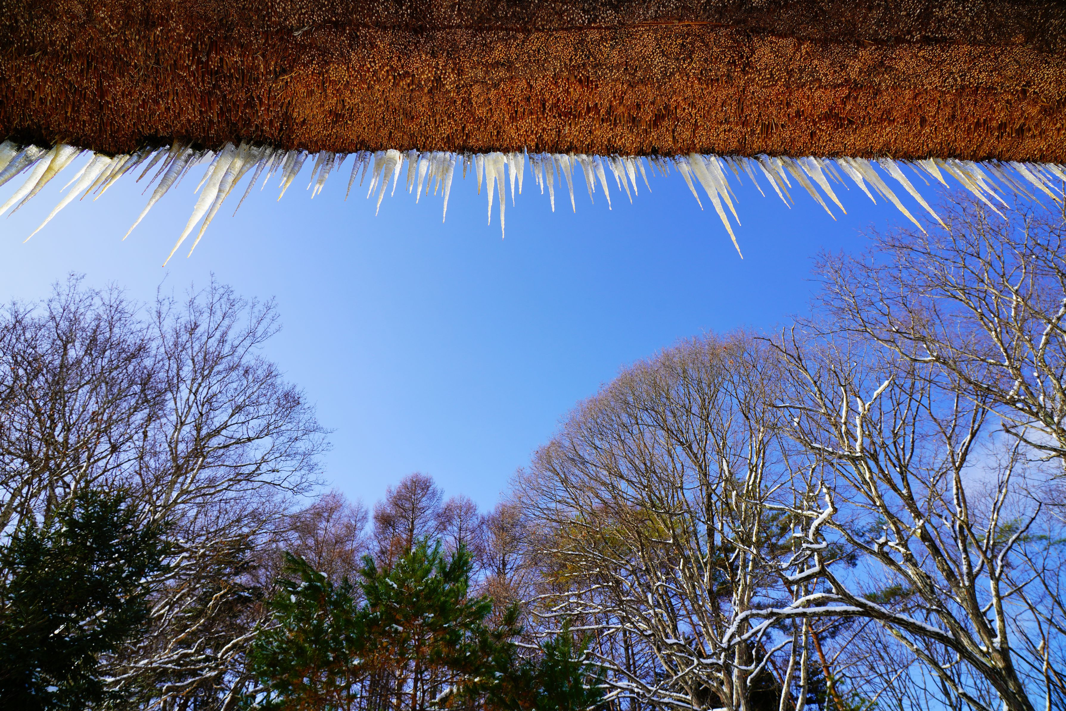栃木県湯西川、平家の里の茅葺屋根に下がるつららです。整然と刈り揃えられた茅葺屋根の軒先と不揃いなつららのギャップ、垂れ下がるつららとは逆に上へ上へと伸びる木々がひしめくさまが青空を挟むように賑やかに感じられました。