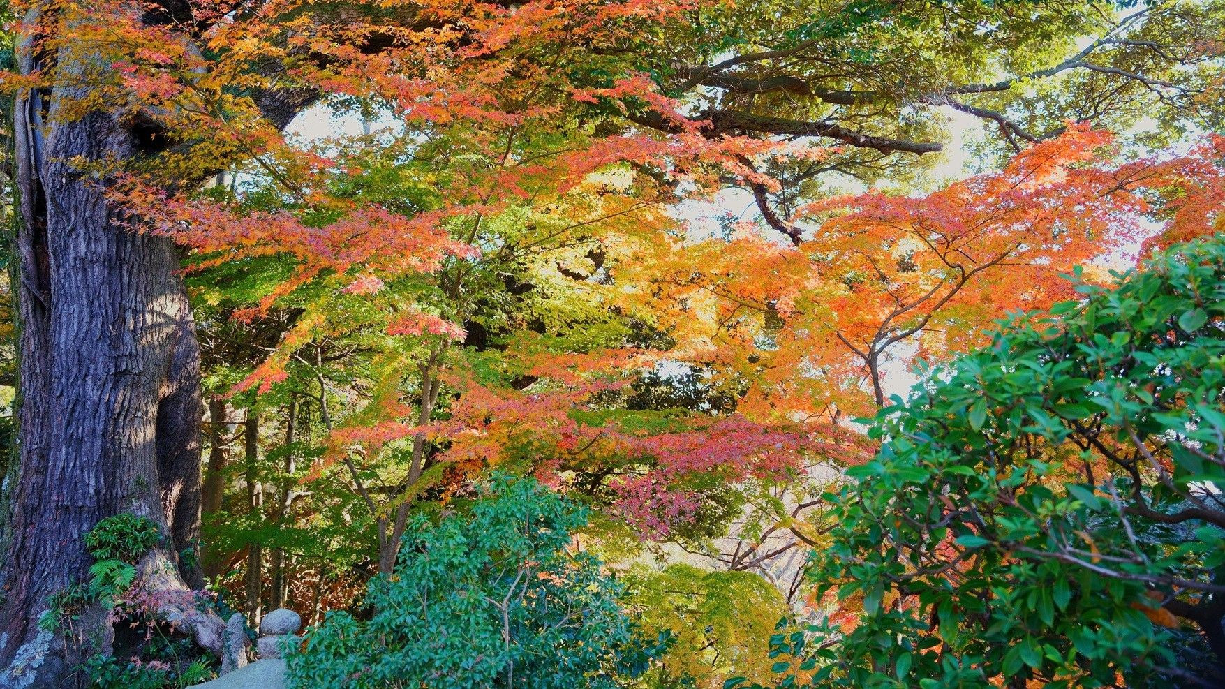 視界の開けた先に紅葉がありました、背景には滝がありました。