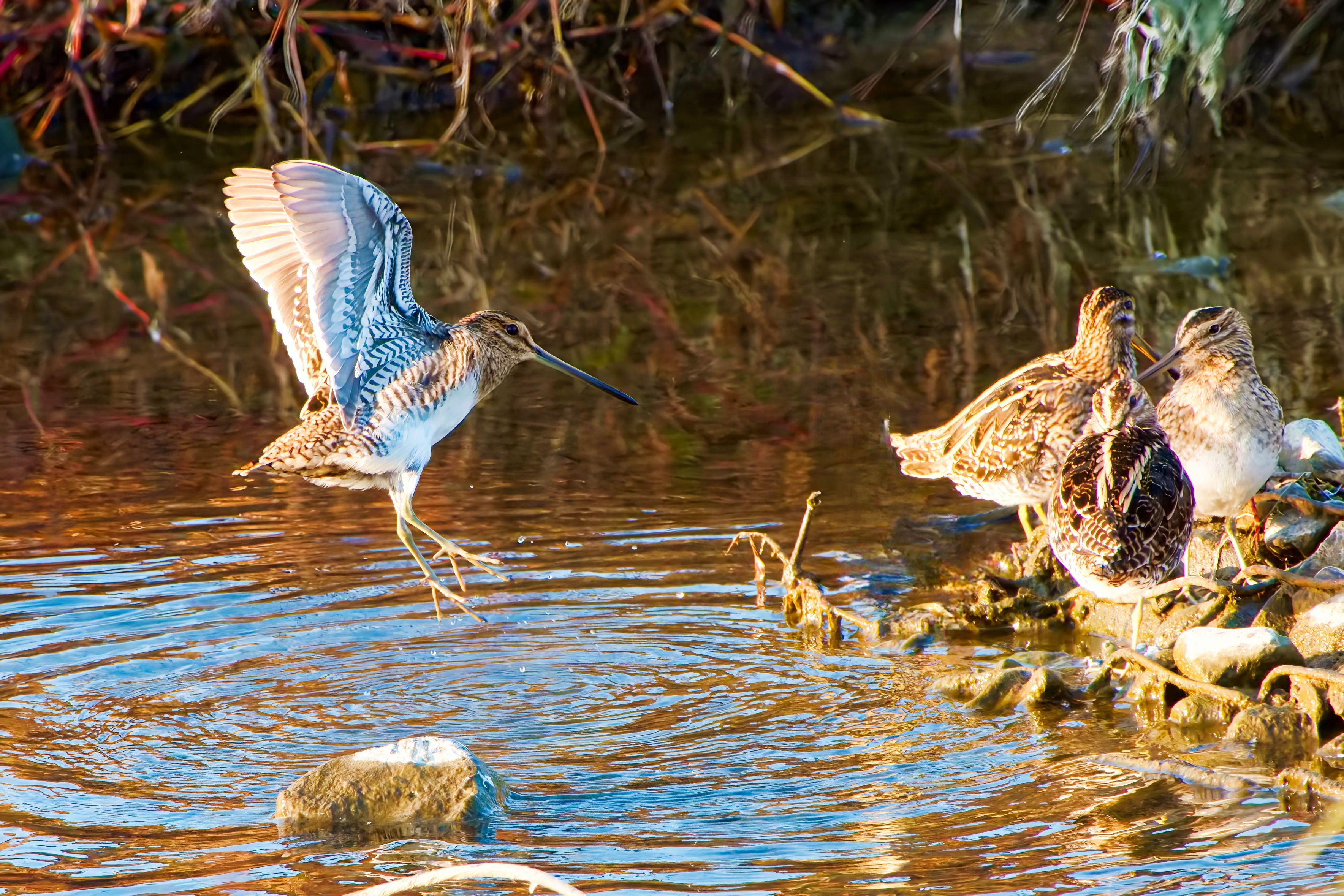 マイフィールドの#タシギ#です。いつもの場所で朝風呂かなバシャバシャしてのスッキリジャンプです。仲間も見守っています(^^)