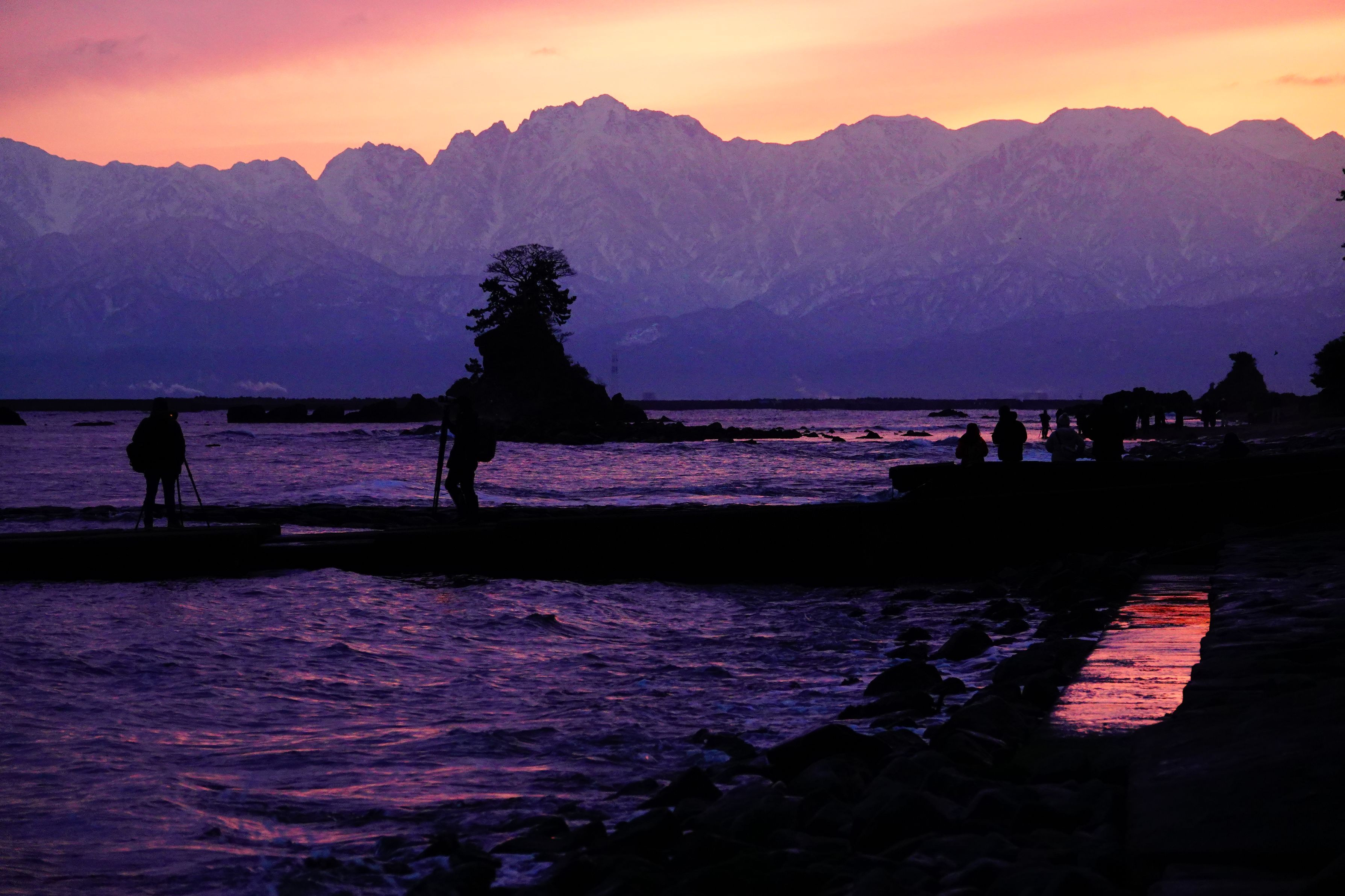 夜明け前の雨晴海岸が朝焼けに染まり雪を被った立山連峰が後ろにそびえたつ風景は壮観だ