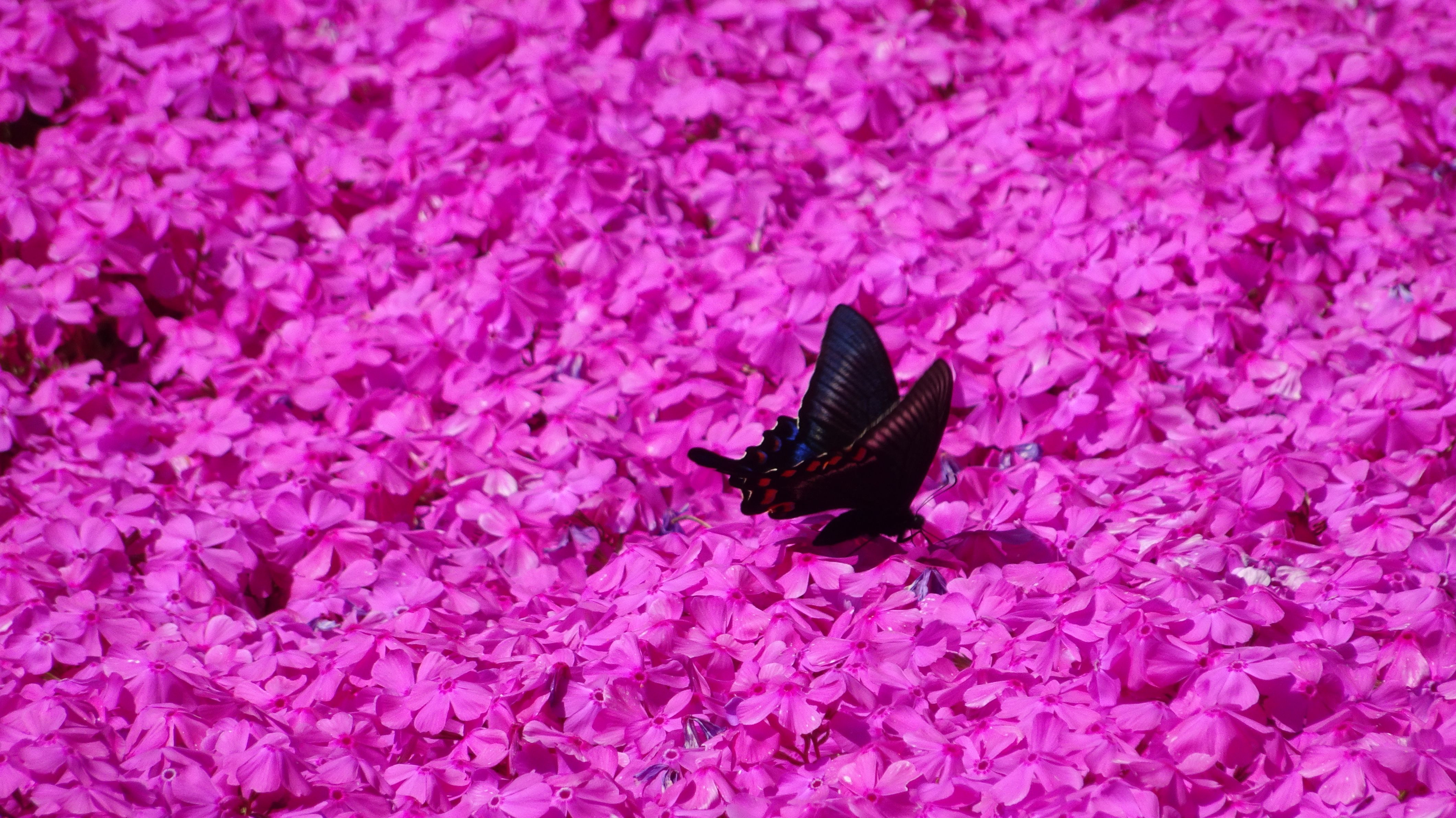 桃色の芝桜に舞う漆黒のカラスアゲハが綺麗でした #カラスアゲハ# #芝桜#