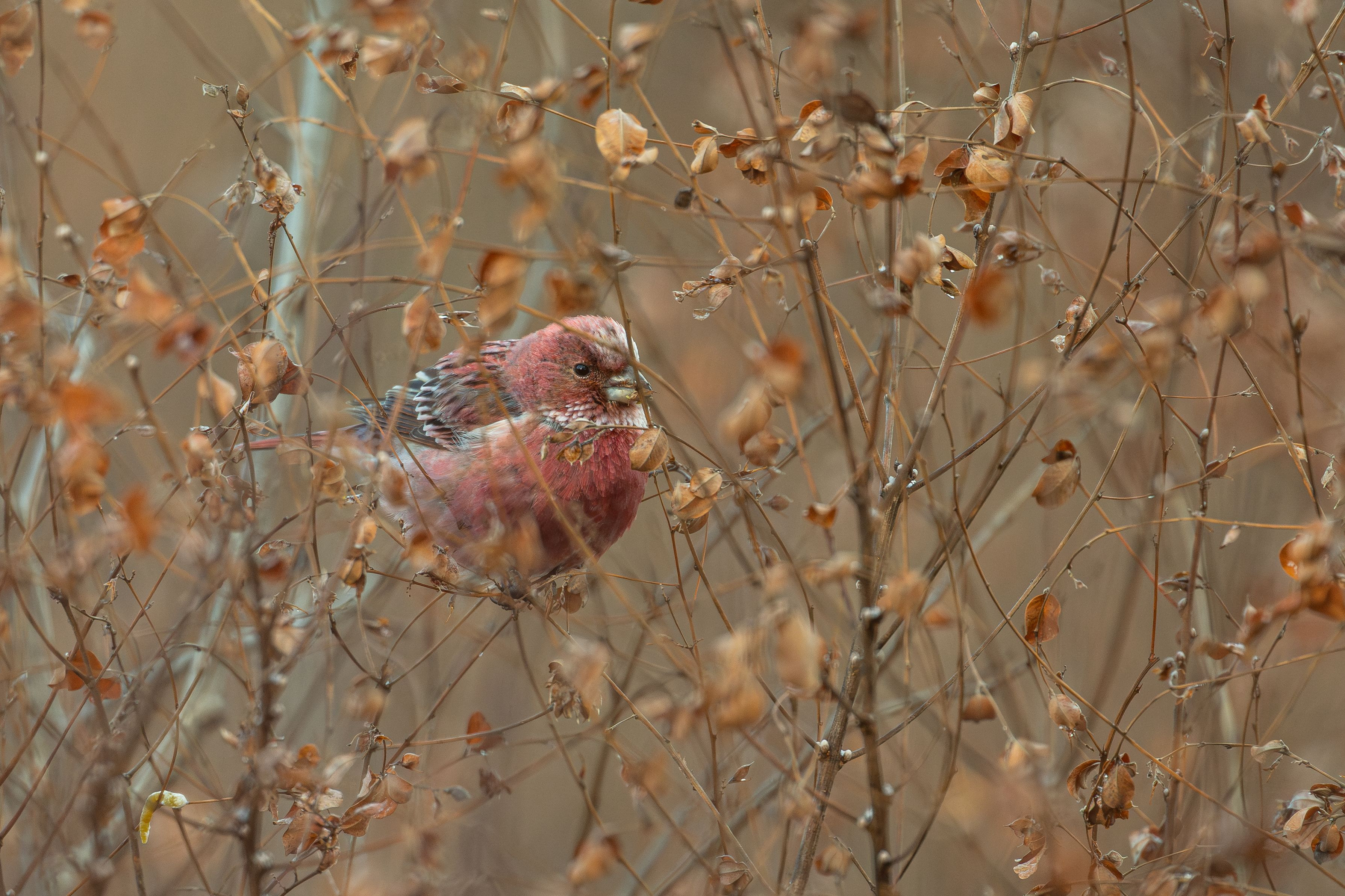 好物の、ハギの実(多分)の中で、お食事中のオオマシコ。 2日間の滞在中、赤い子に出逢えたのは、このワンチャンスのみ。 願わくば、食事の後に被りのない所に出てきてほしかったのですが、 願い叶わず、そのまま遠くの森へと移動して行かれました。(^-^) #オオマシコ#