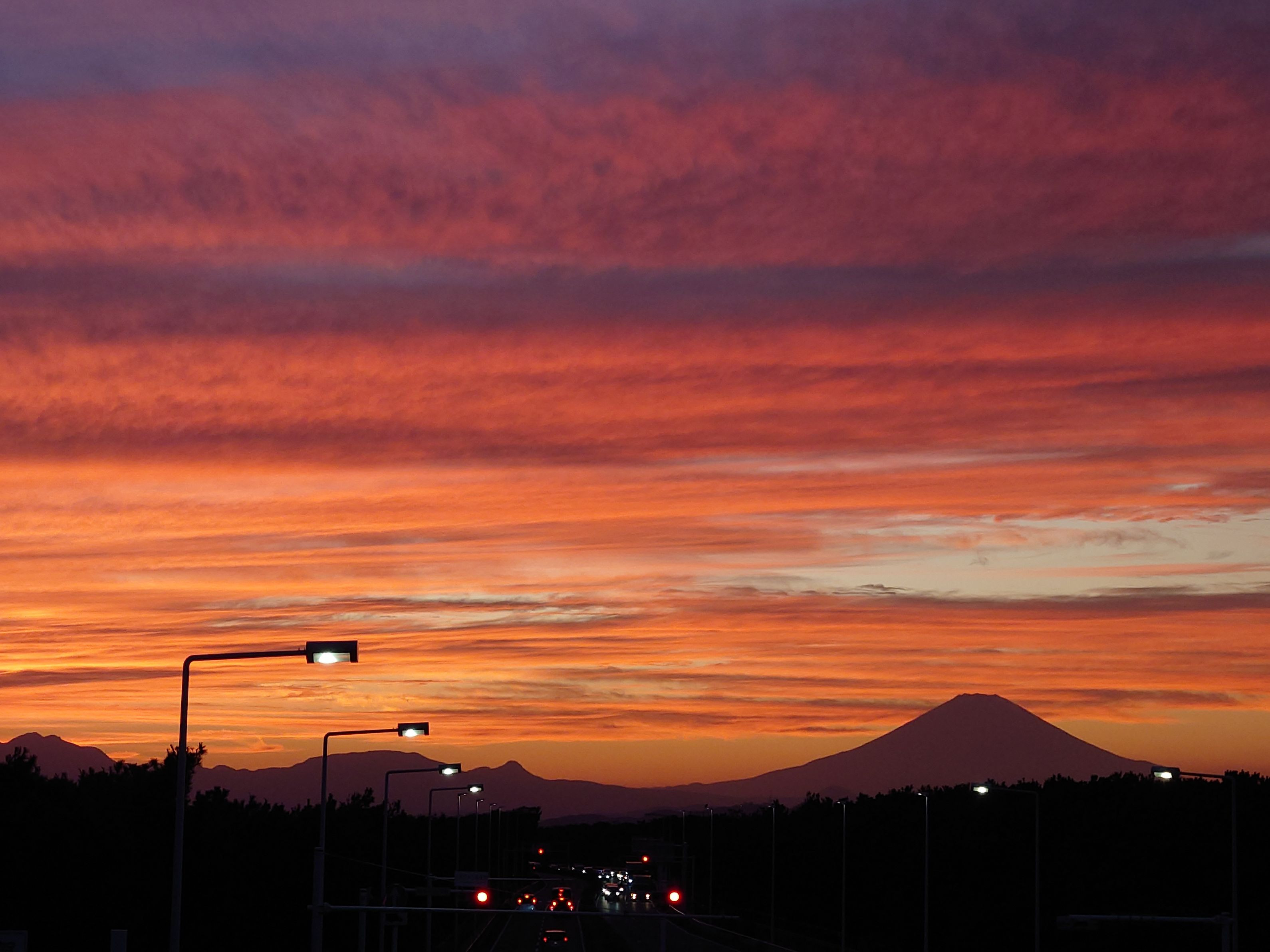国道134号線陸橋から望む夕焼けの富士山
