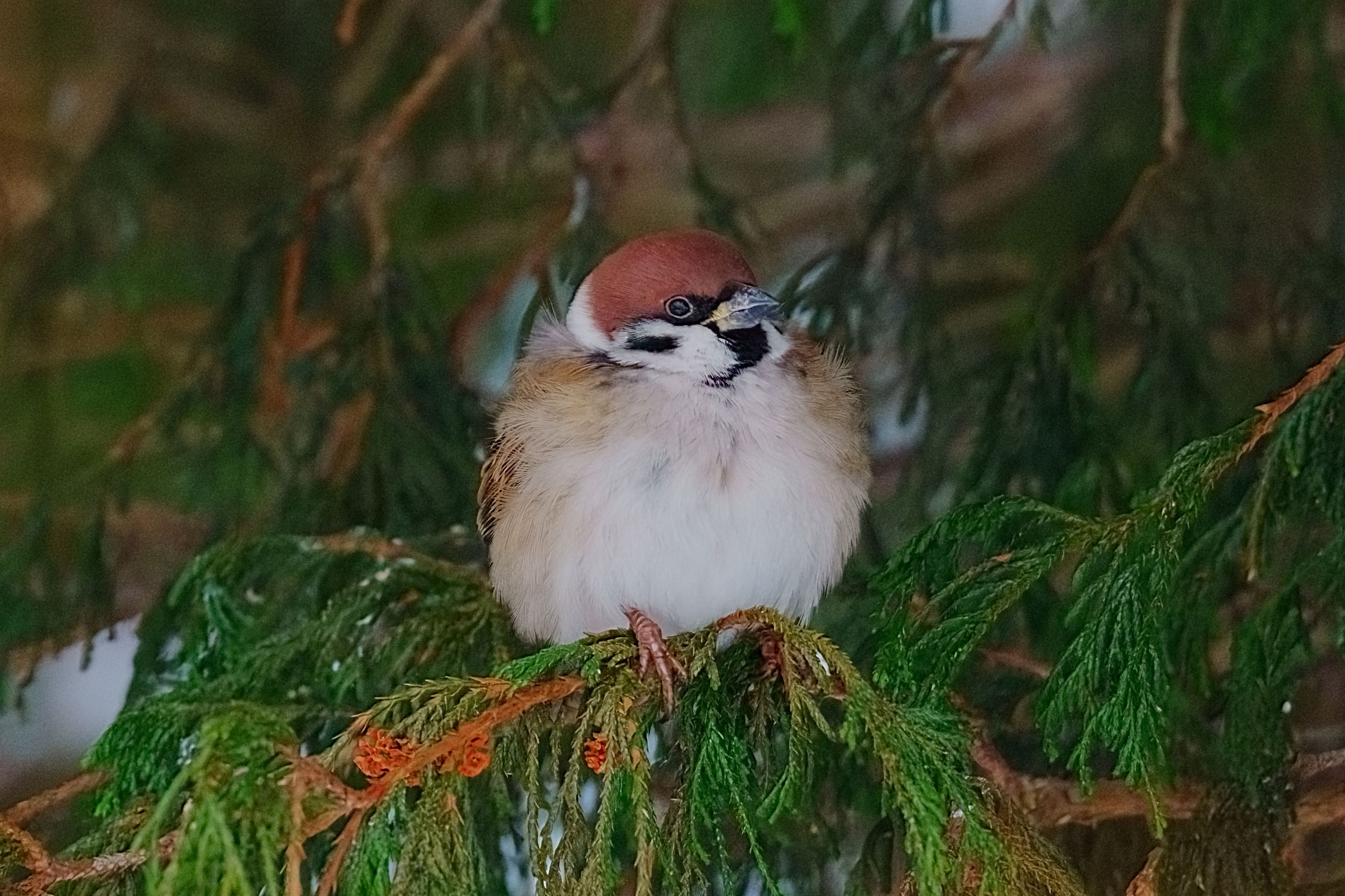 厳冬期になり、保温のために羽毛を膨らませてモフモフで可愛い雀ちゃんです。