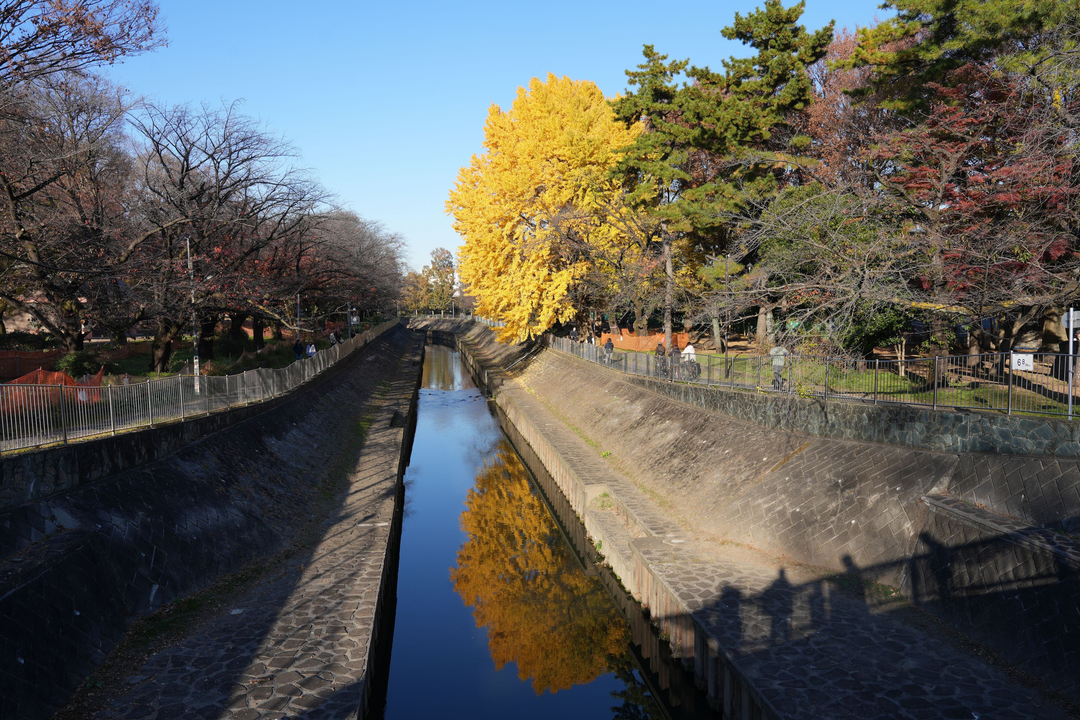 杉並区 善福寺川のイチョウ、川面にもイチョウ