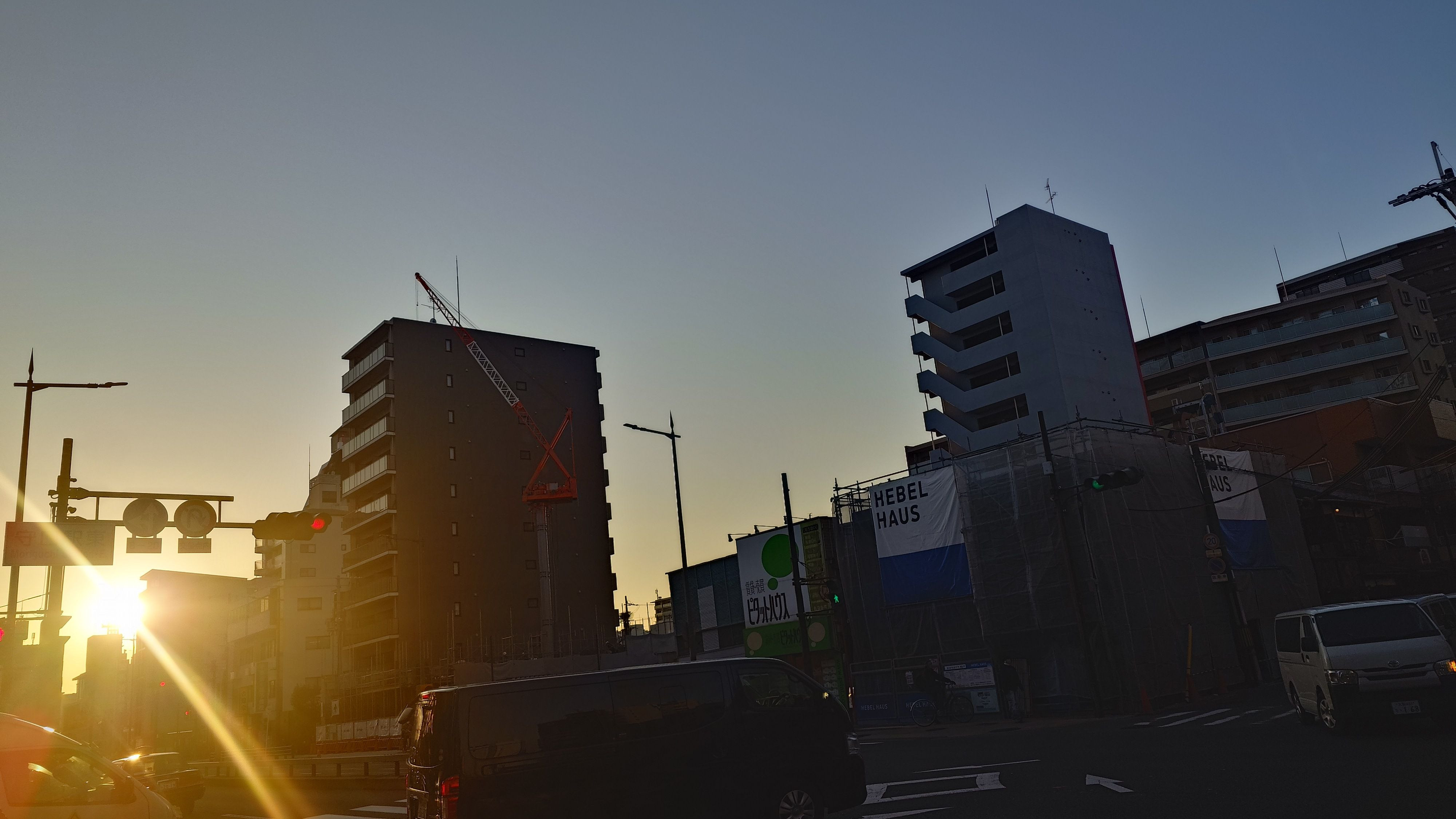忙しそうに走る車やバイクを覆うように、西日が落ちていくのが印象的な街角です