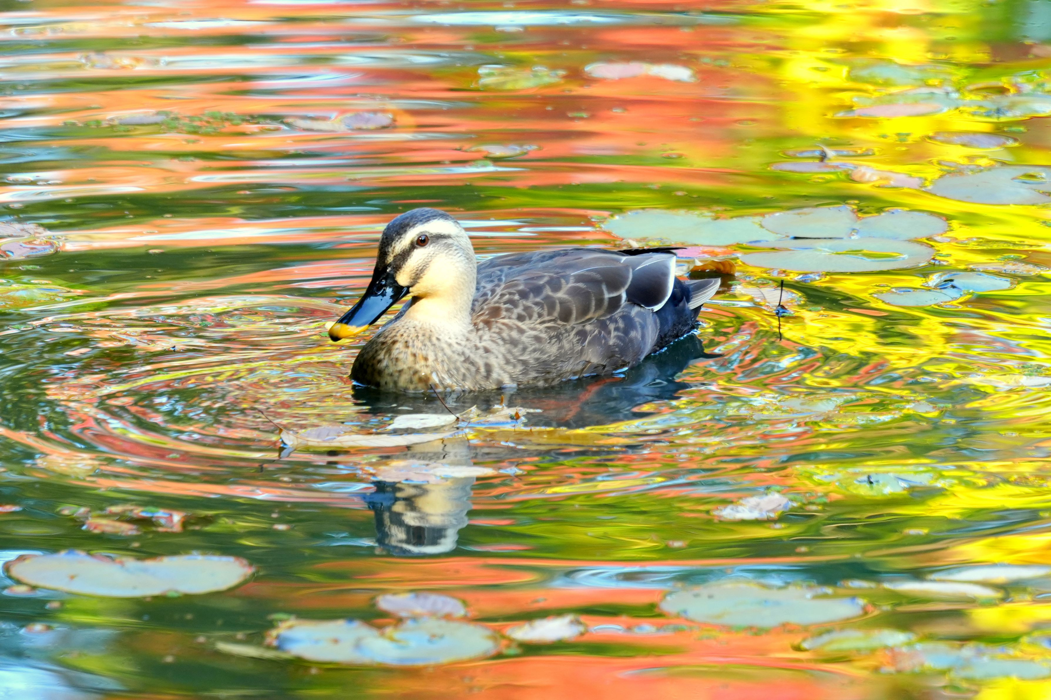 周囲の紅葉を映す池をのんびりと進むカルガモ