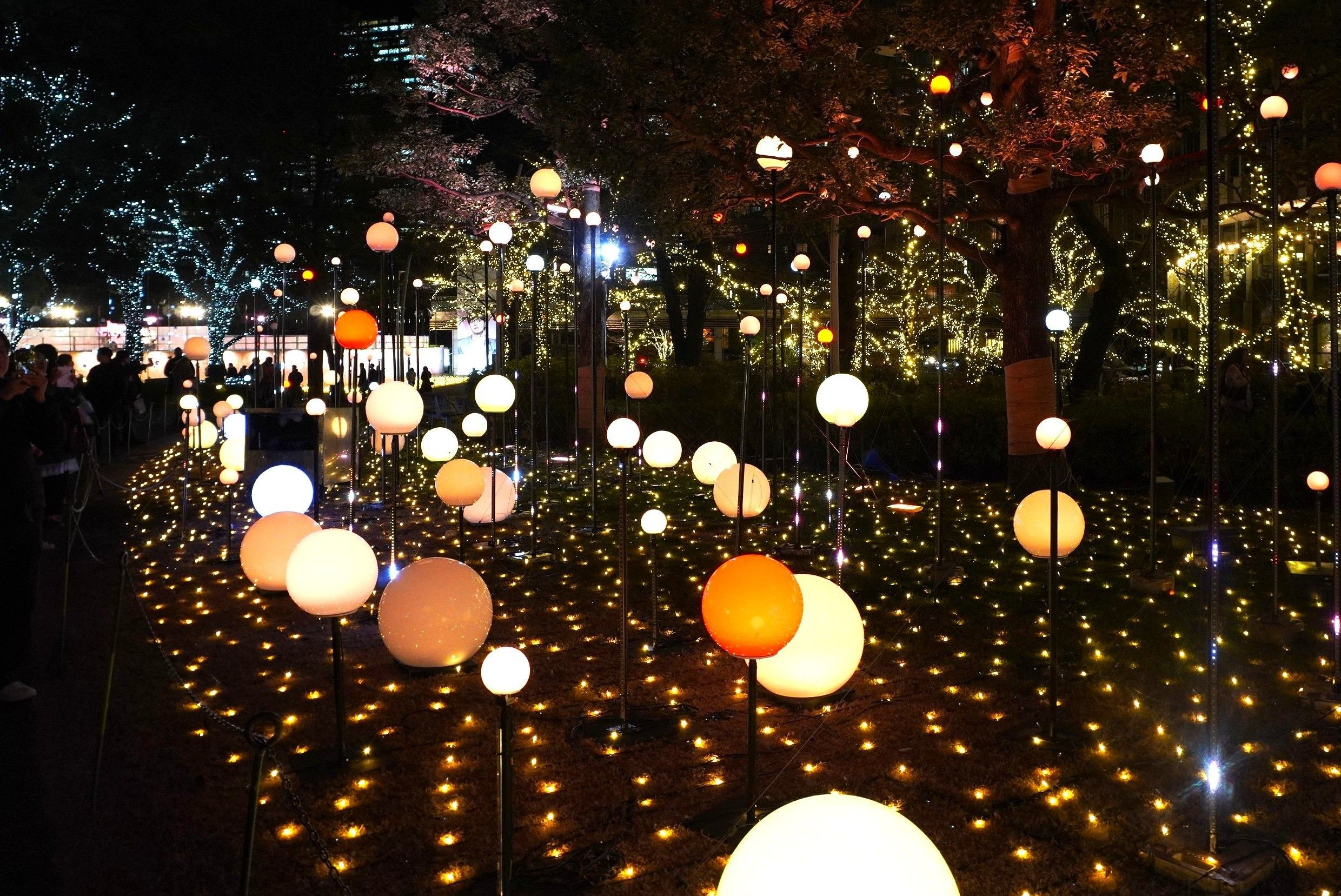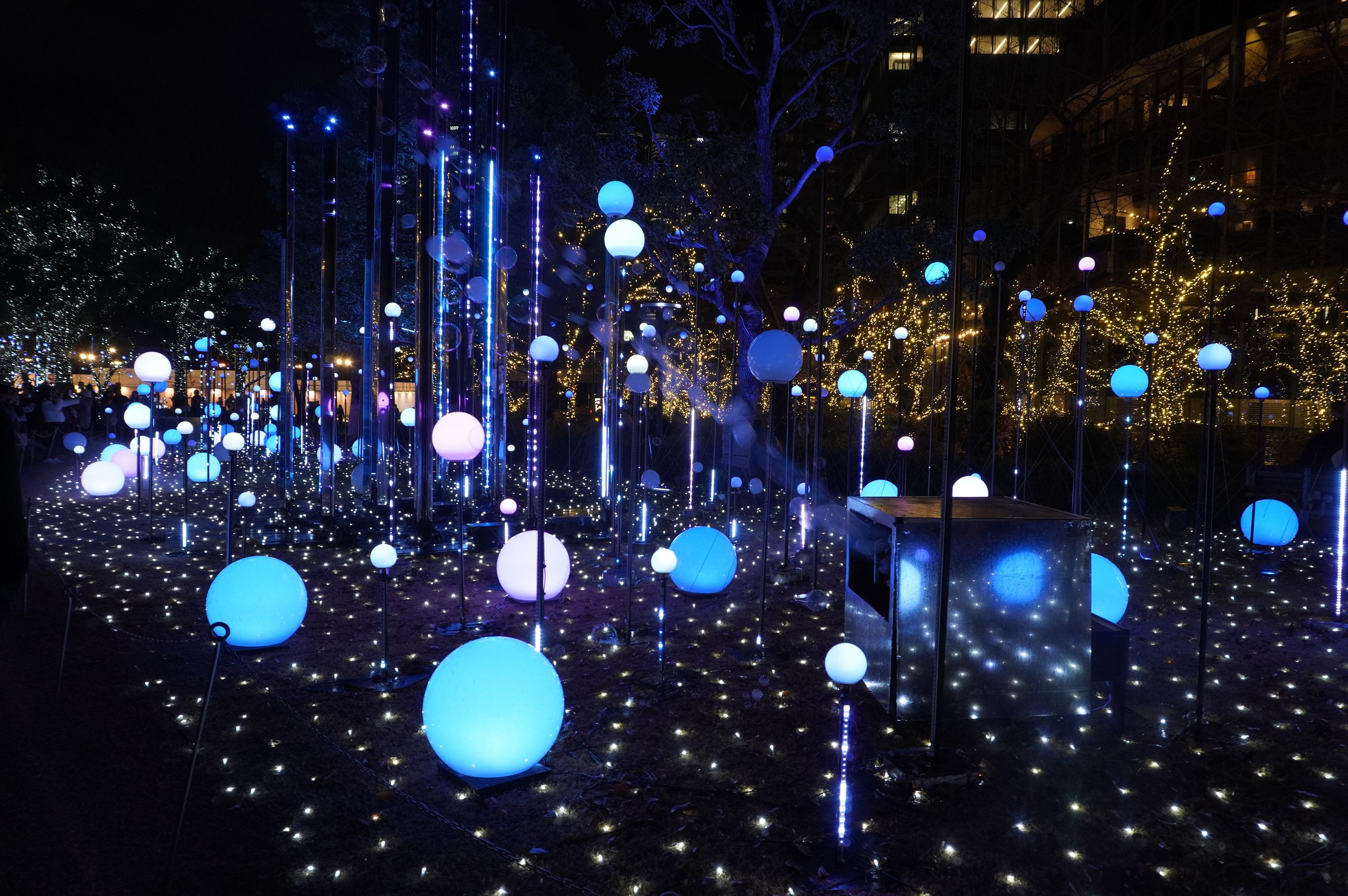 クリスマスイルミネーションとシャボン玉の共演。 シャボン玉が現れるたびに歓声が上がって、 楽しい演出でした。
