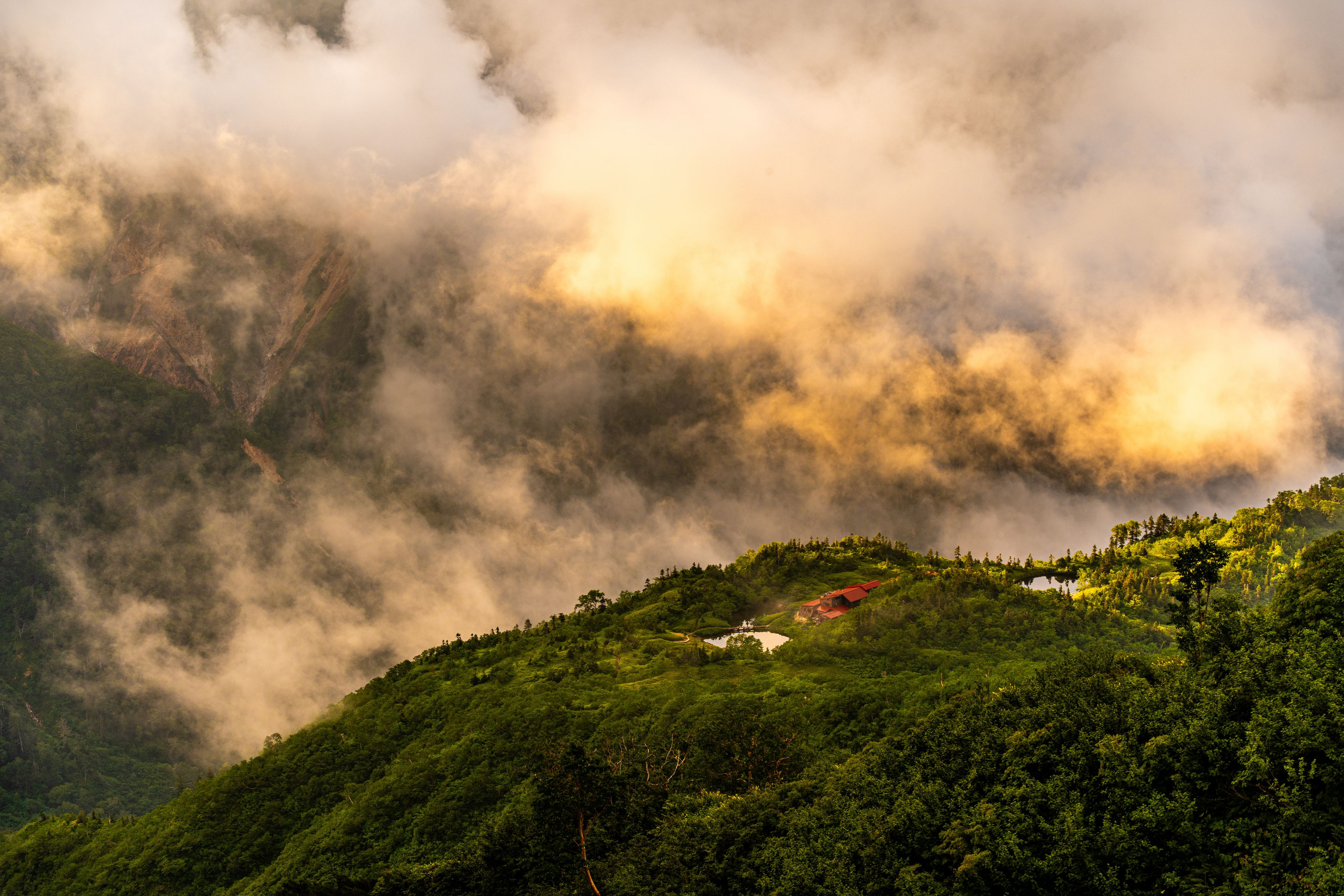 一面霧で覆われた夜明け前、山荘を出発して双六岳へ 途中少しだけ霧が晴れると、朝のオレンジ色の光が山荘の周りに漂う雲や草木を照らしました。 標高2,300mの鏡平山荘は、まるで空中から現れたような幻想的な佇まいでした。