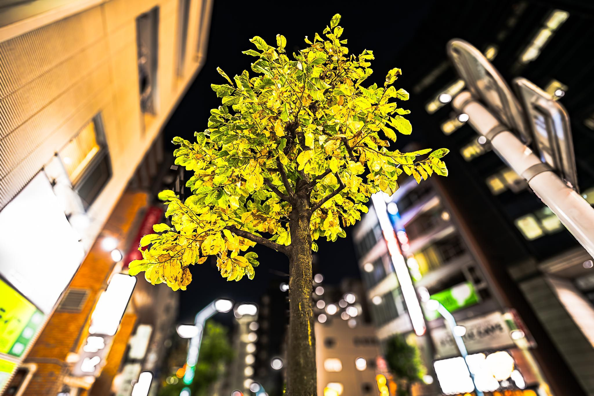 高円寺駅前にて。冬の街角を照らす街路樹。