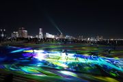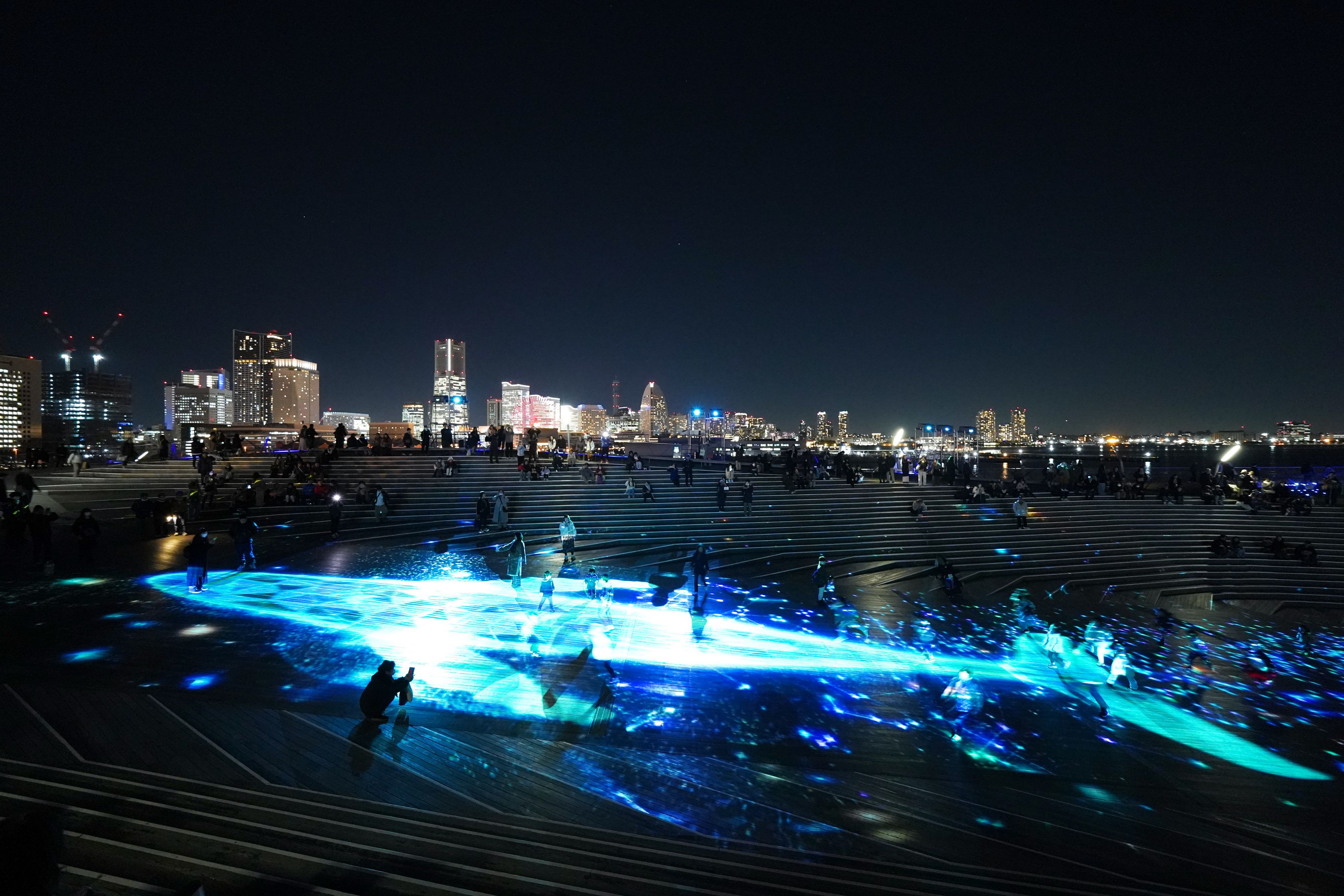 横浜で行われてるイベント”ヨルヨノ”です。 大桟橋にクジラが出現、子供たちが鯨を追いかけて楽しんでます。
