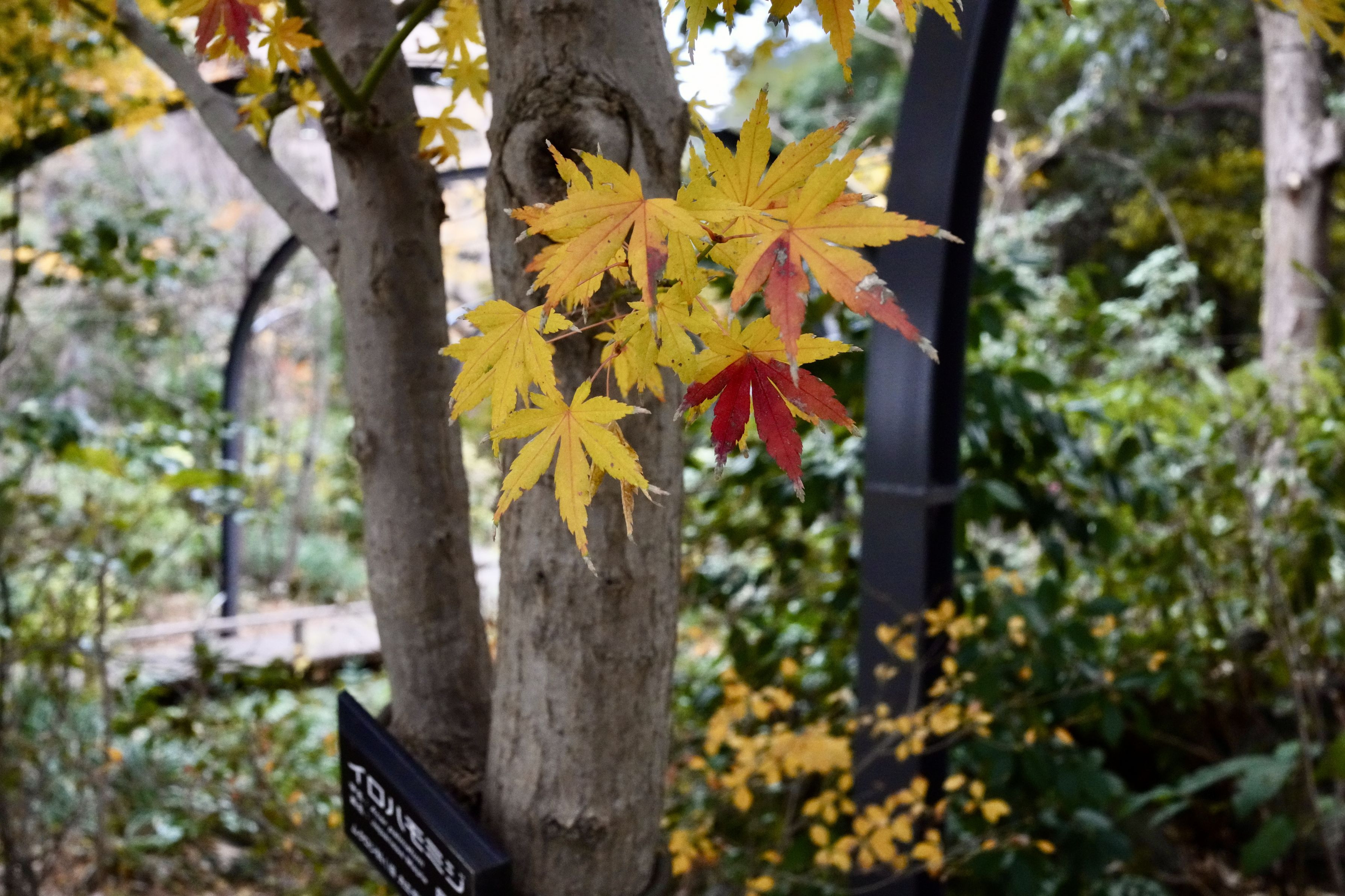 寄木細工のような色合いの散りかけ紅葉