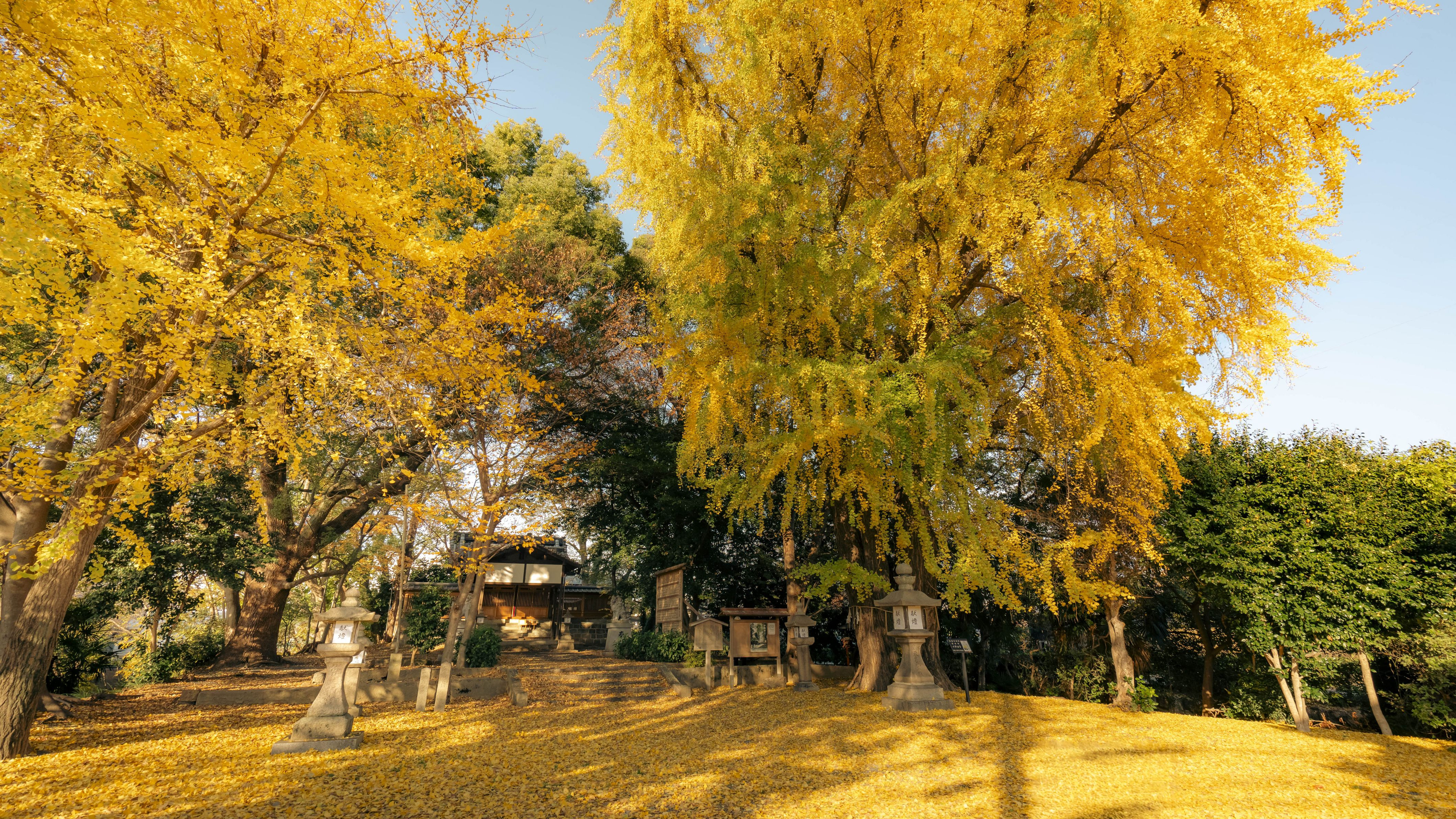 京都伏見にある神社の境内がイチョウの黄色で染まる