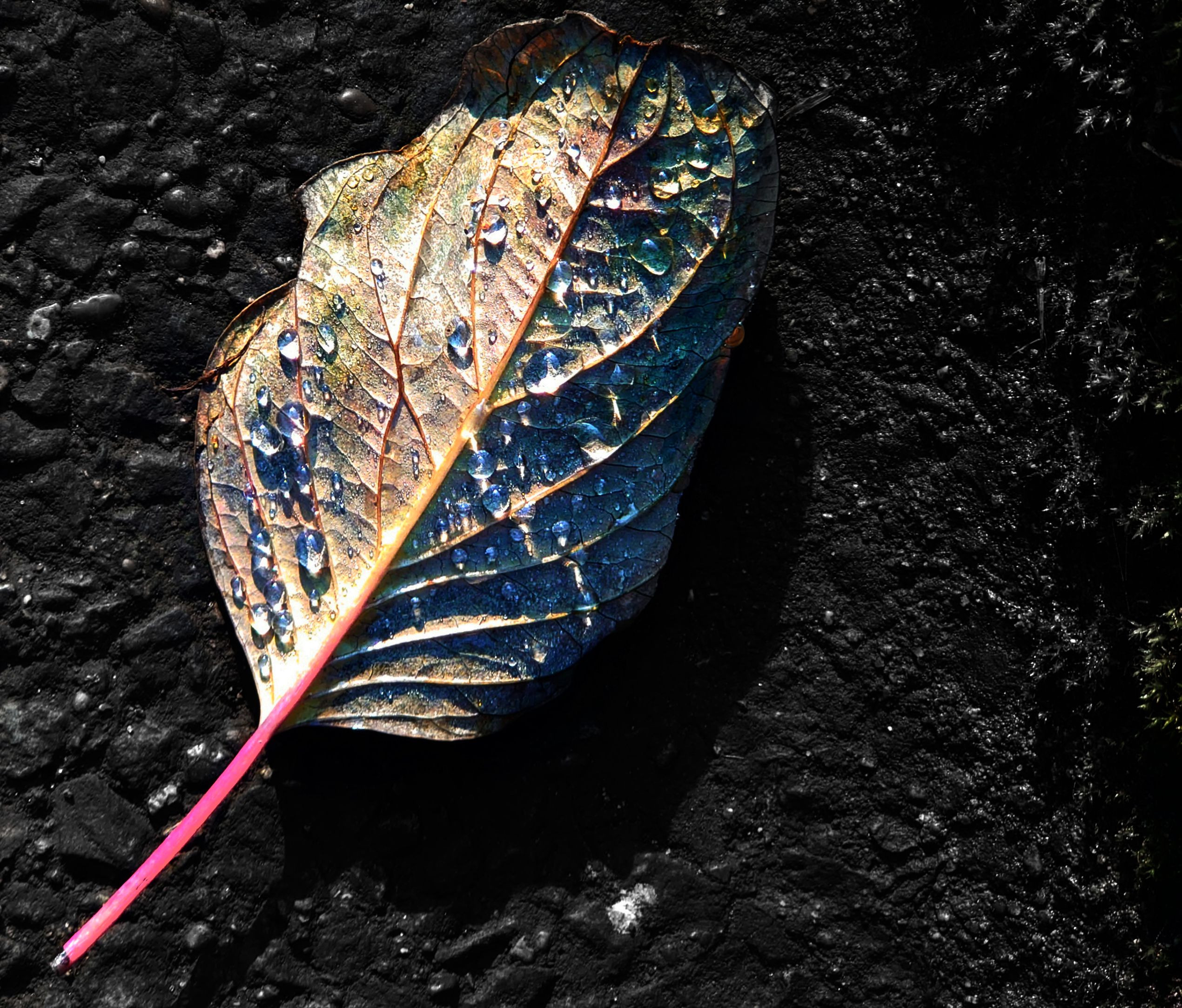 落ち葉の表面に付いてた雨粒が外灯の灯りで輝いて見えてたので背景の色を白黒にして、落ち葉に生命が宿っているように強調してみました。