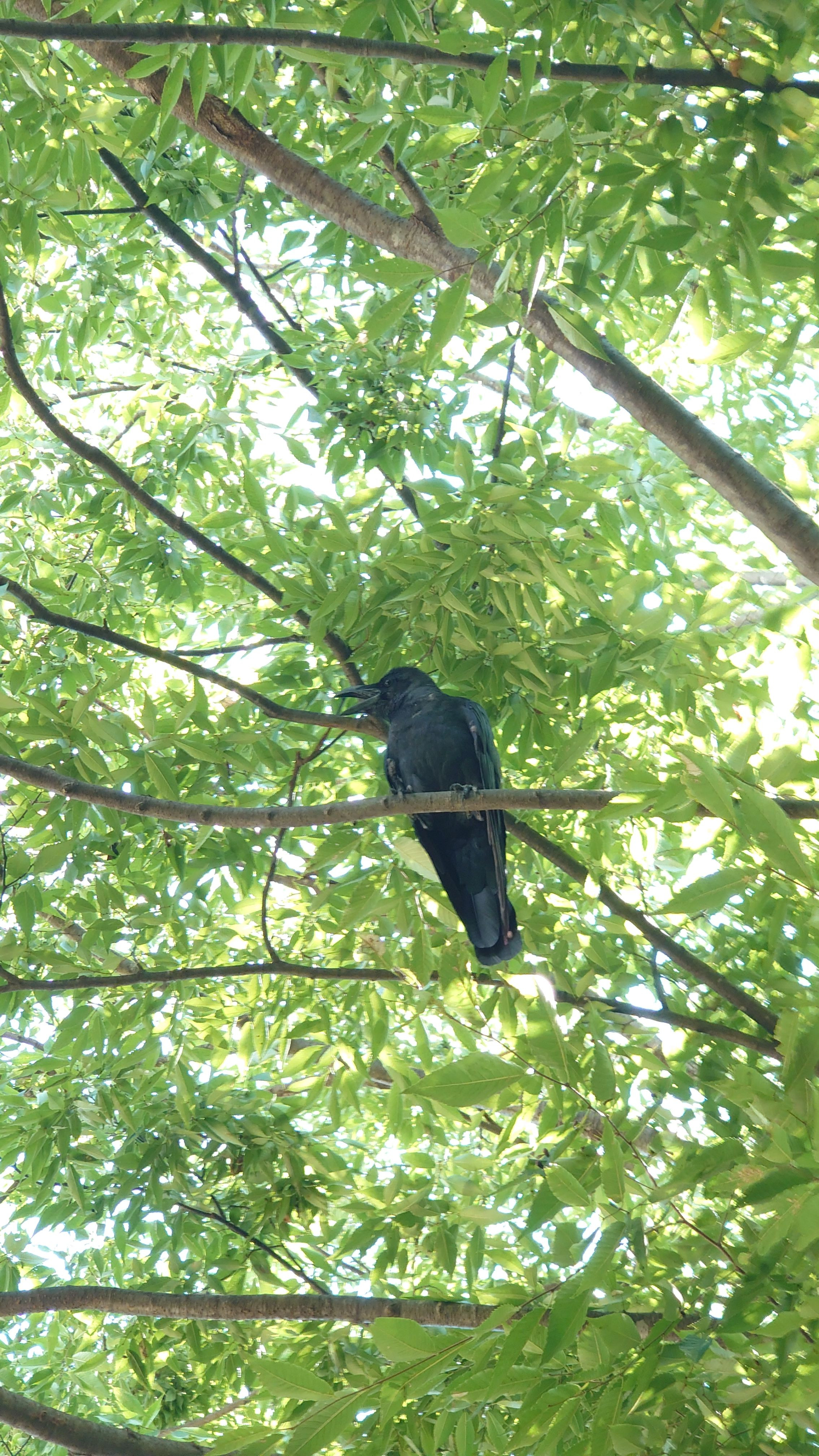 暑い夏に緑の中で陽射しを避けているカラスが愛おしい