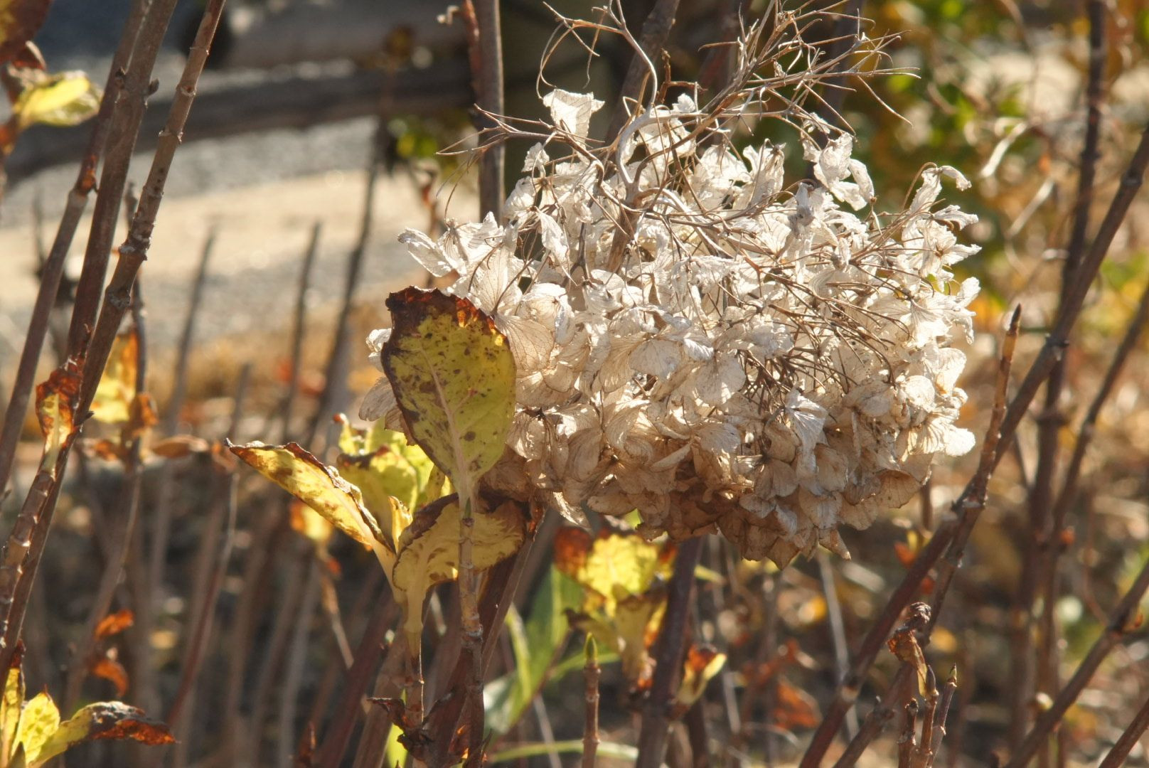 冬のアジサイを撮影しました。いつも気にも留めないのですが枯れたアジサイの花もなかなか味があります。マクロ100mm にエクステンダーをつけてマニュアル撮影しました。