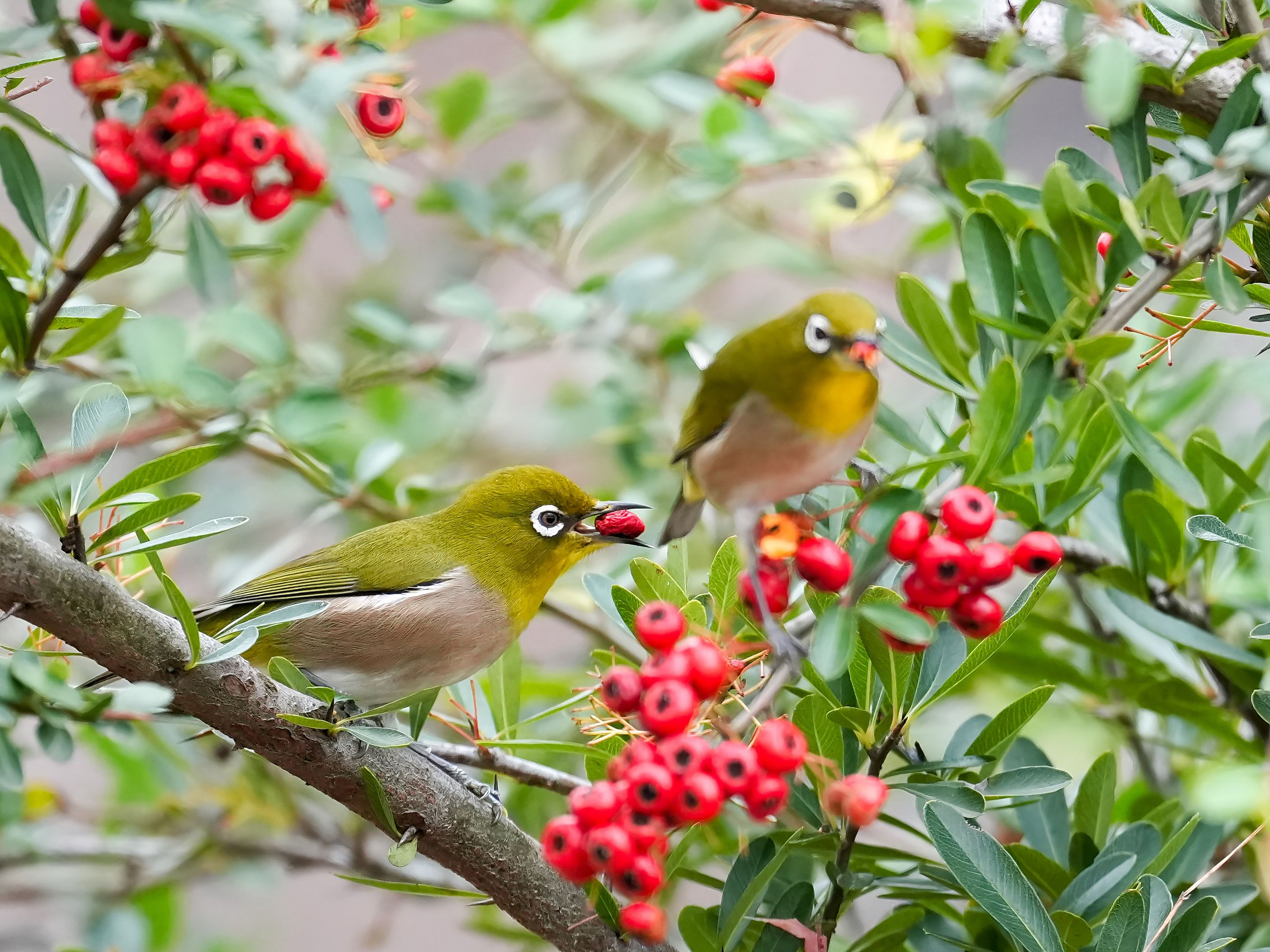 2025年12月 ピラカンサの実を仲良く食べている#メジロ# 偶然クリスマスっぽいカラーになりました♪