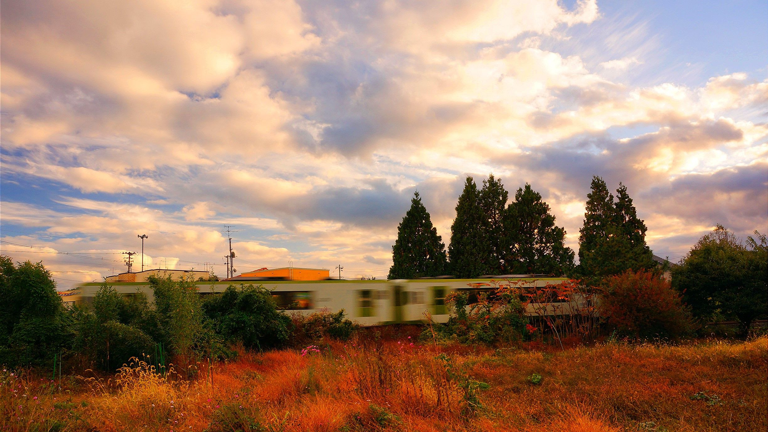 晩秋の夕暮れに庭先を通過する列車(大湊線)