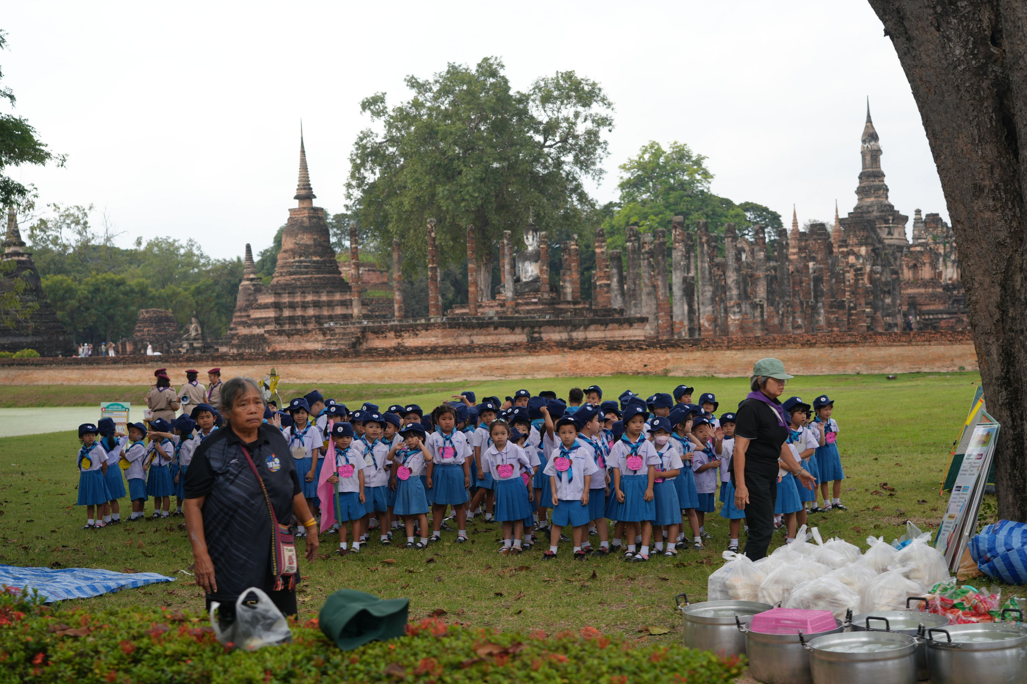 タイの古都、スコータイで出会った子どもたち。ボーイスカウトなのか分かりませんが、お行儀よく並んで先生の話を聞いていました。場所は、スコータイ歴史公園、世界遺産に登録された由緒正しきタイを代表する文化遺産です。右にはズラリと鍋が並んでいます、石造りの遺産だから「火気厳禁」ではないんでしょうね。メニューはやっぱり、カレーでしょうか。石像も、優しく見守っているようです。