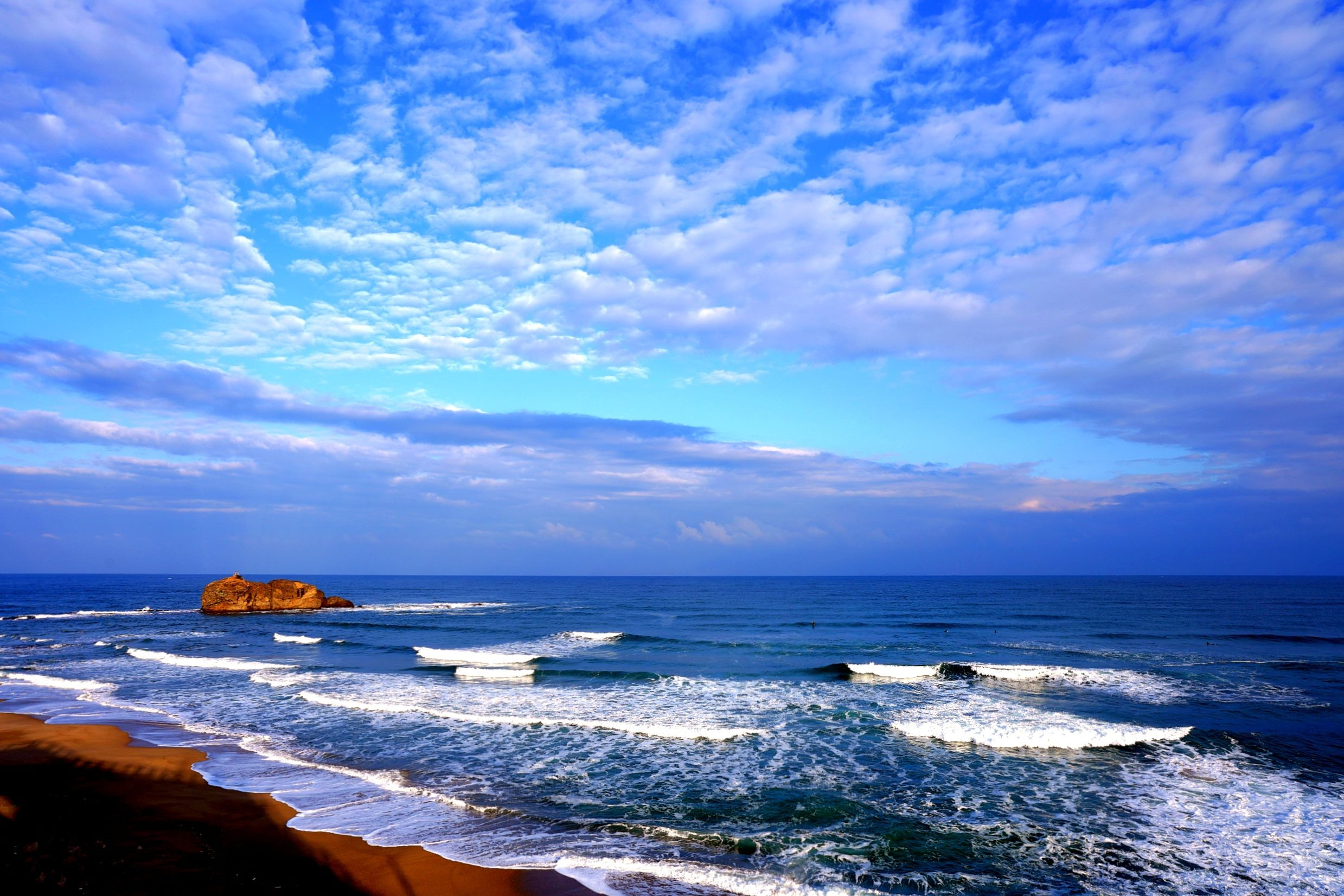 鳥取市白兎海岸_12月の朝 日が昇ると雲が消え青空が見えました。 日本海の青い海、白い波が鮮やかでした。