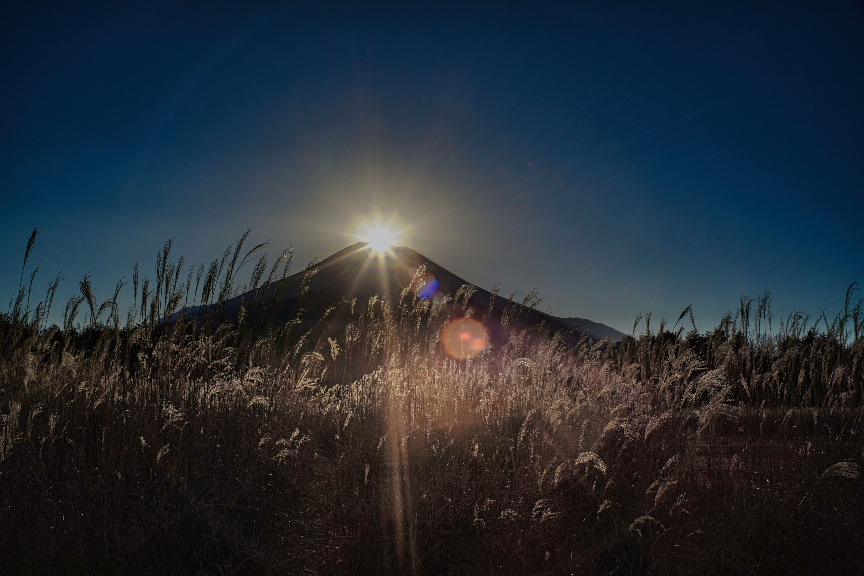 山梨県山中湖村の花の都公園からのダイヤモンド富士 第2駐車場を閉鎖にしてダイヤモンド富士撮影場所になります。 オールドレンズの円形ゴーストで富士山を囲みました。 USSR線「MIR-1B M42 37mm F2.8」絞り枚数:10枚・10本光条 #山梨県#