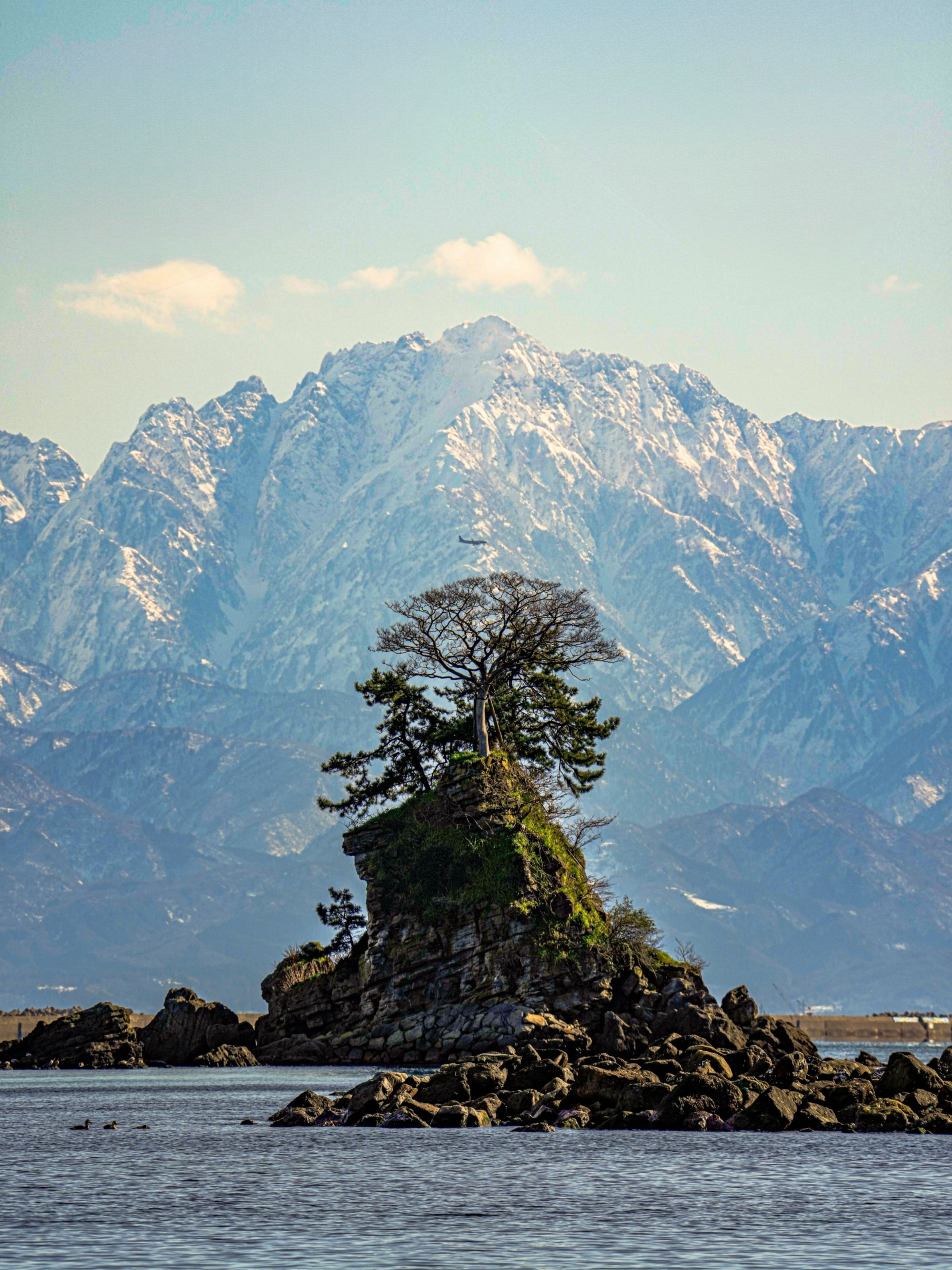 晴天の雨晴海岸 劔岳、ANA NH315便、女岩 の3並び