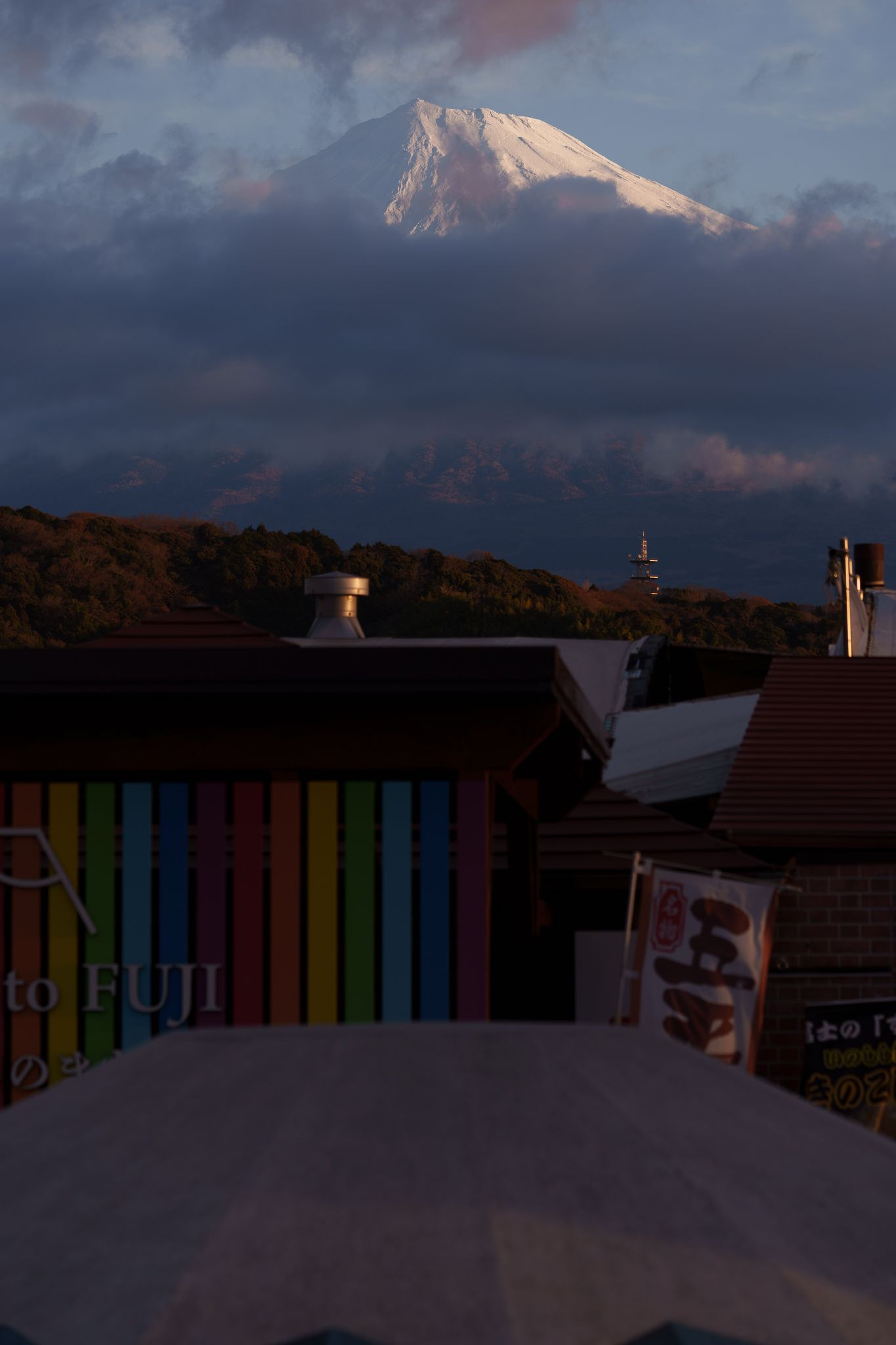 東名高速富士川SAでのひとコマ。 朝焼けの中、雲の切れ間から僅かに顔を出してくれた富士山。 SONY α1 + TAMRON 150-500mm (A057)